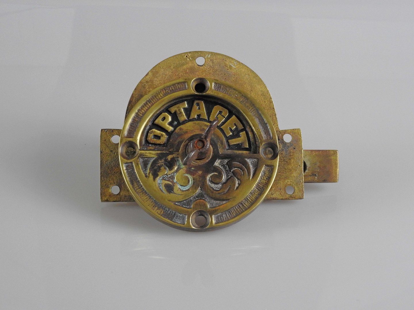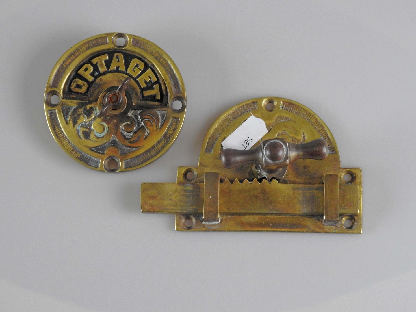 Toiletlås i messing. Med sidelås og tekst optaget/fri.