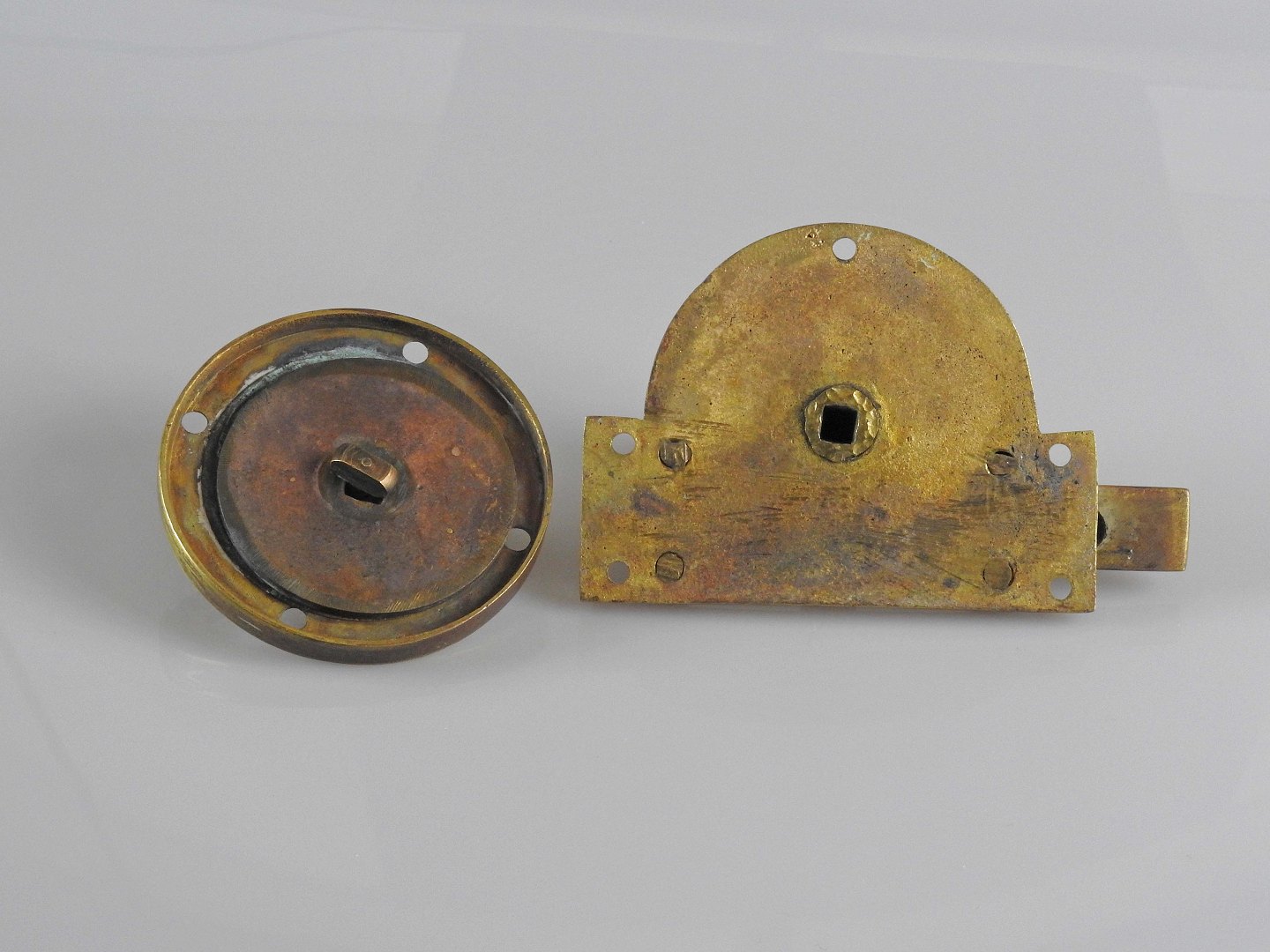 Der mangler forskruning mellem de 2 beslag, fløjmøtrik på fri/optaget er ikke original, Forskruning kan nemt laves, men afhænger af tykkelse på dør.