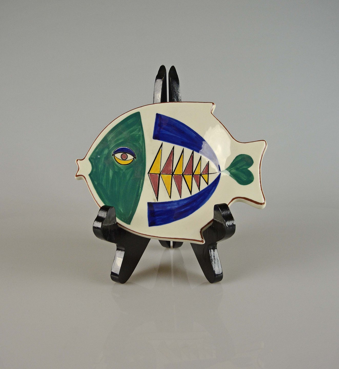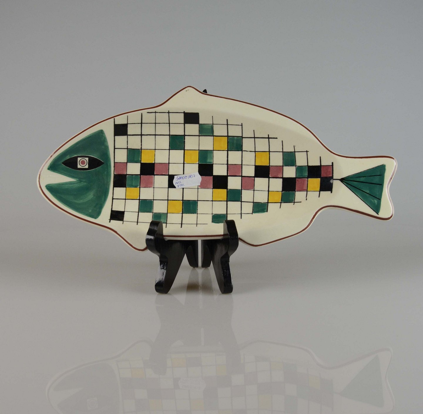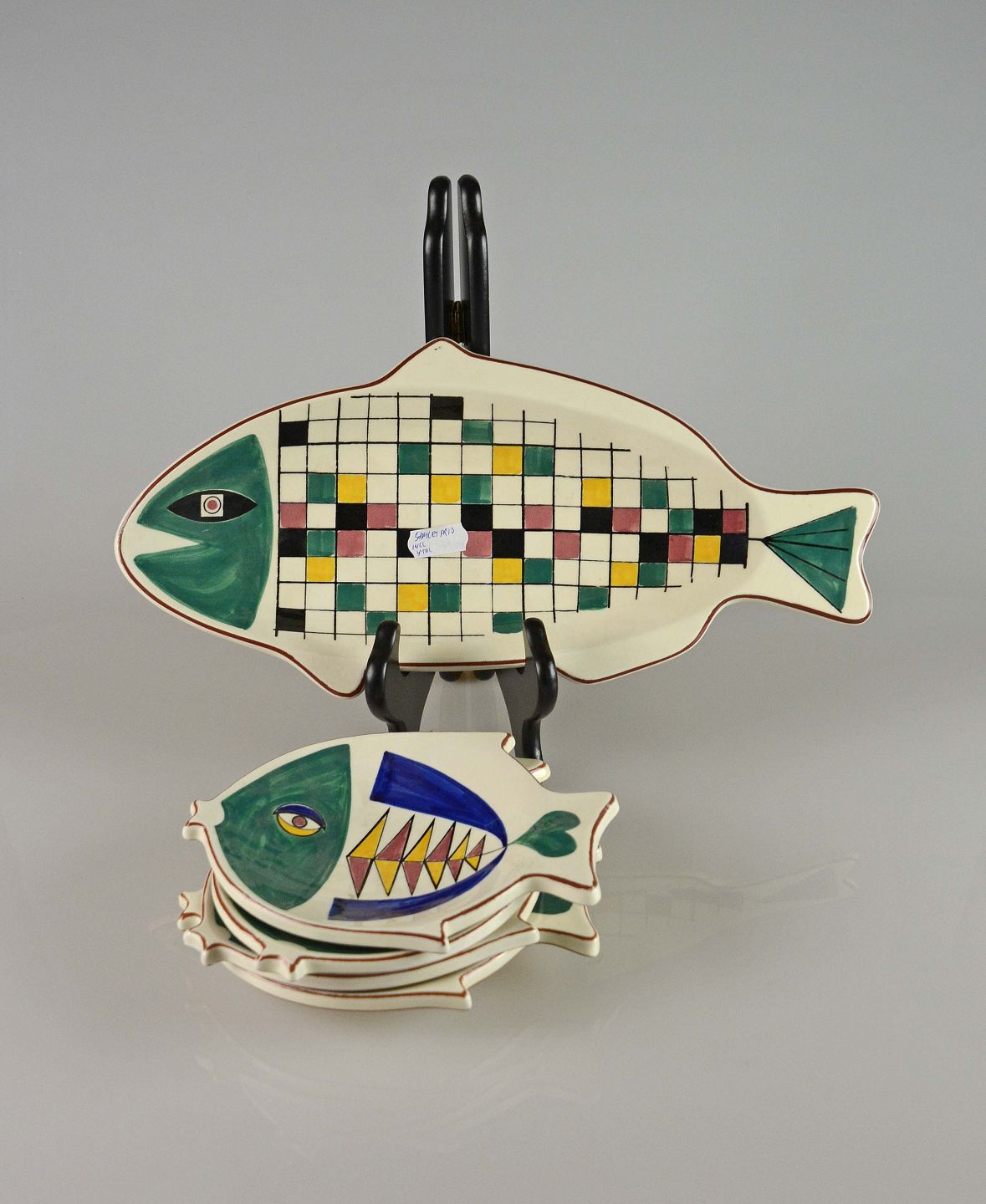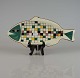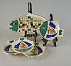 Et fad med tilhørende fire tallerkener udformet og med med motiv af fisk. De tåler opvarmning.