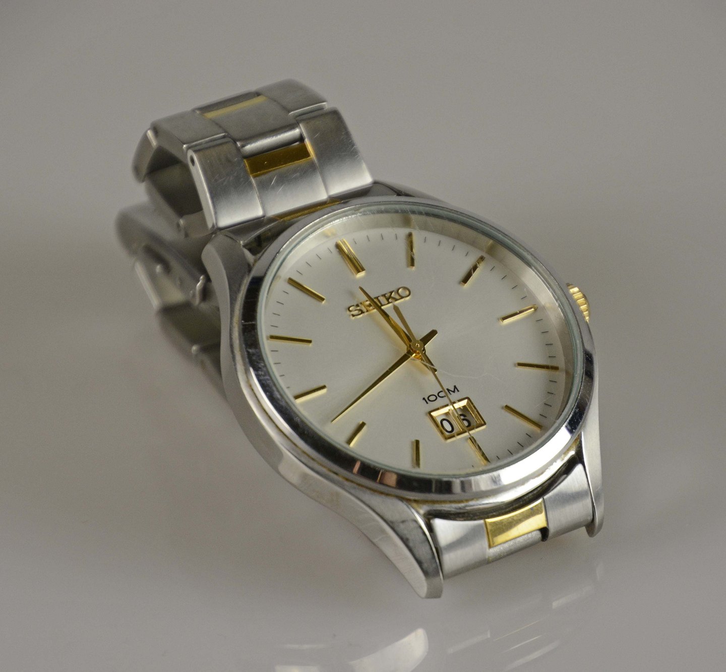 Seiko herrerur med dato, lænke og gyldne mellemled.