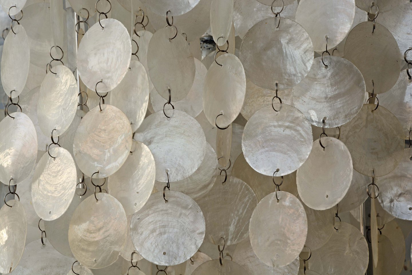 Lampenfod af blankpoleret metal med skærm af strenge af perlemorskaller.