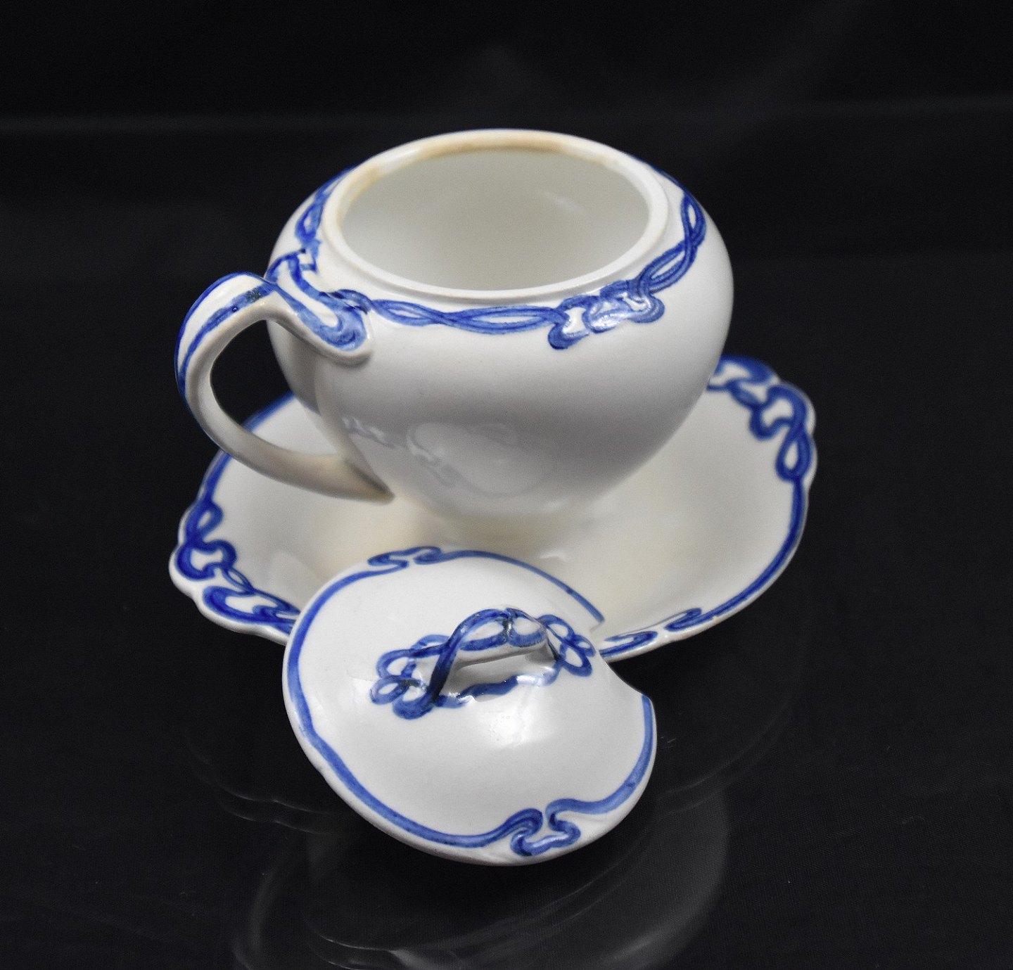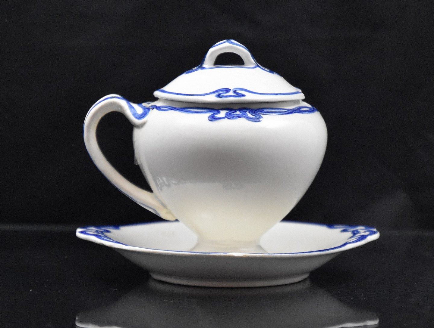 Blå Olga, Sennepskrukke, med hank og fast tallerken