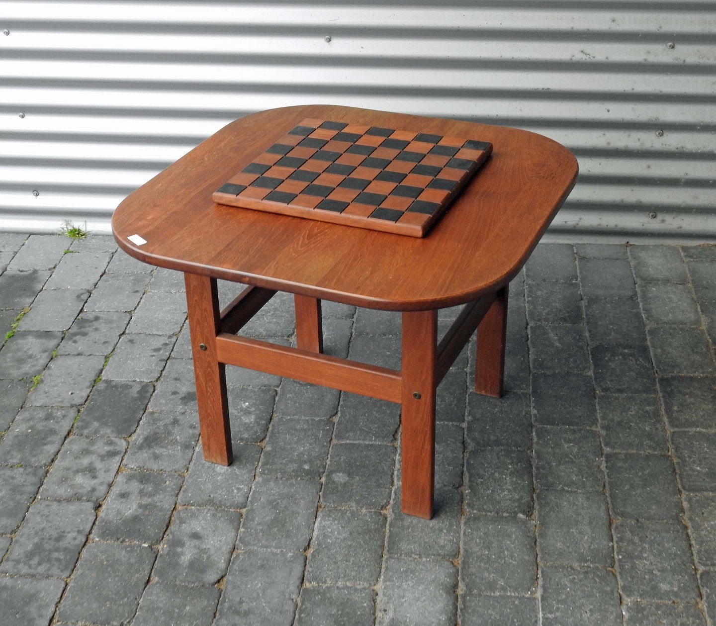 Sofabord med hylde, som også er en aftagelig spilleplade, der kan bruges til skak eller dam.