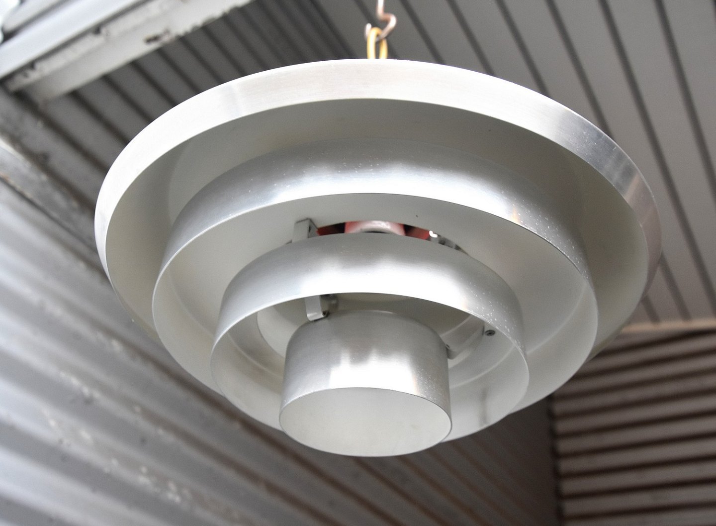 Mat sølvfarvet pendel, hvidmalet indvendig, dog er der lidt rødt i toppen