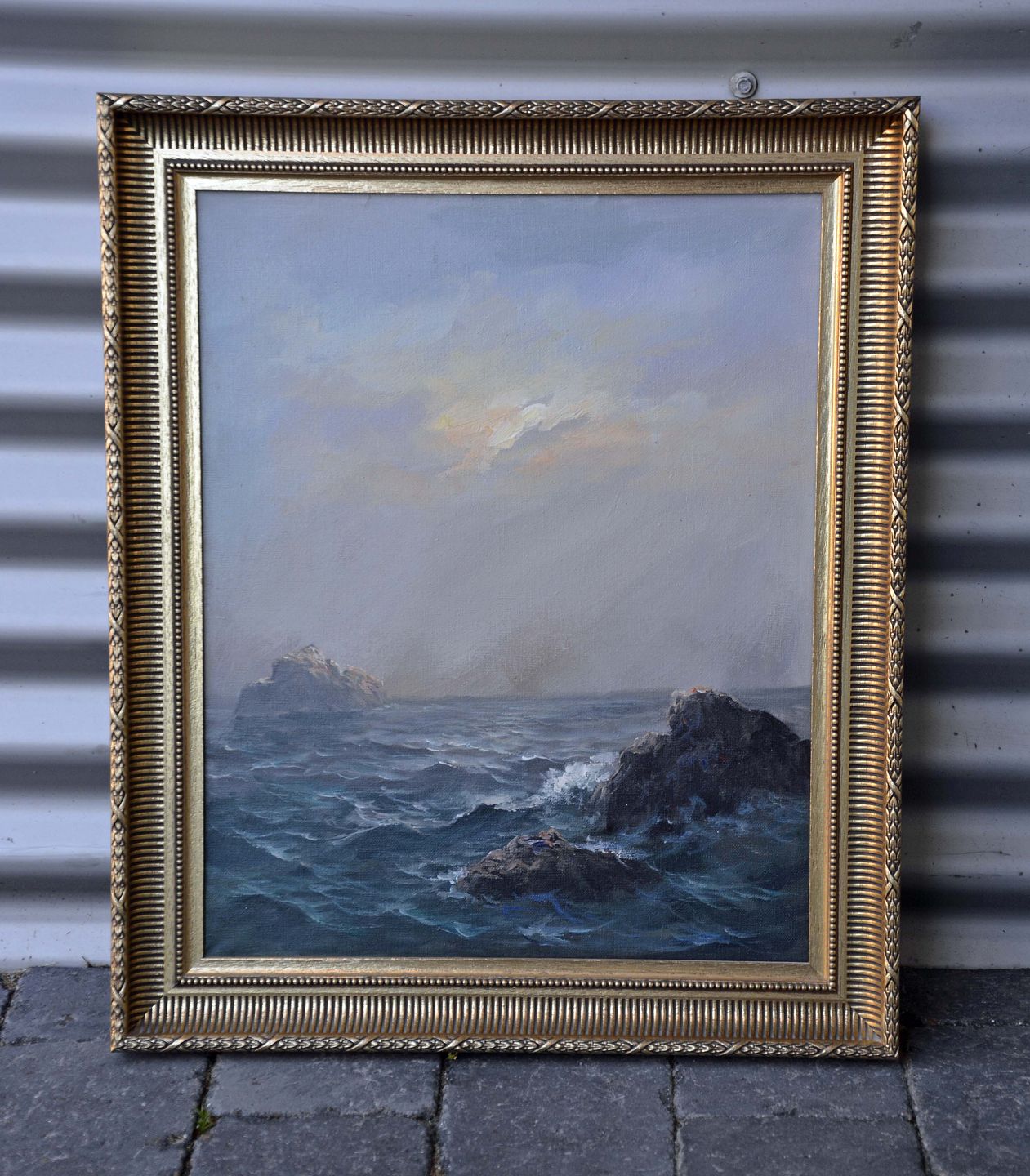 Maleri med motiv af klipper i havet af ukendt kunstner