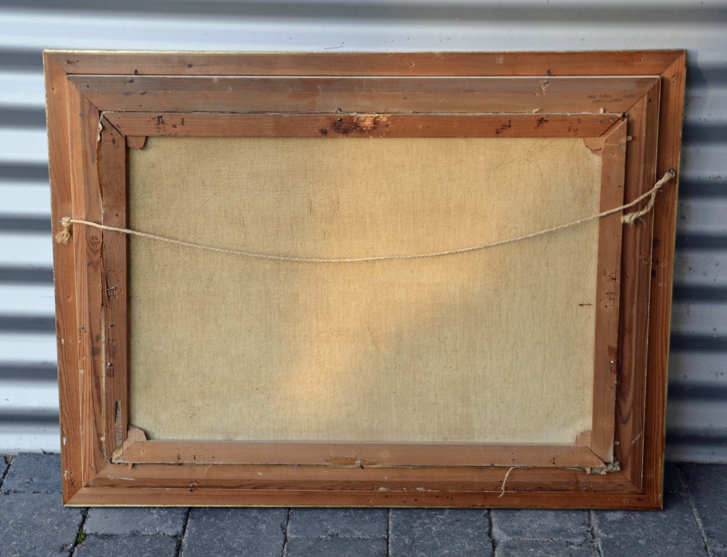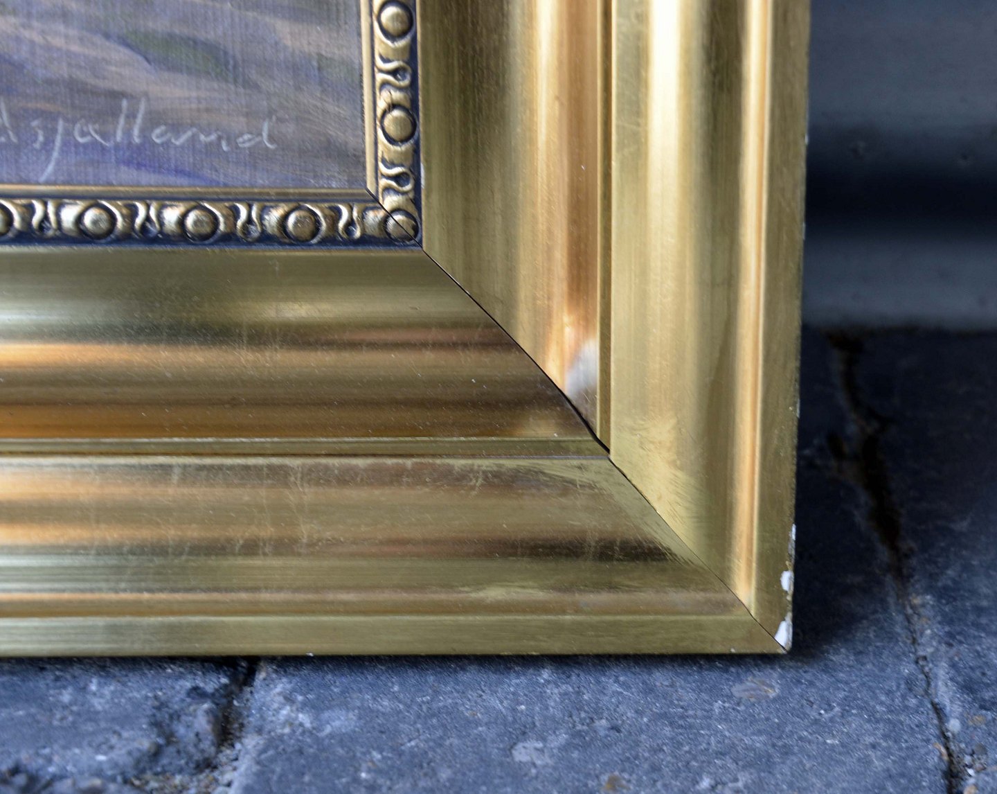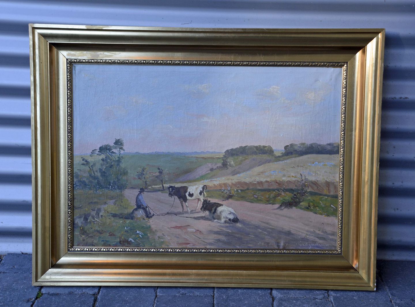 Landskabsmaleri med motiv af siddende bonde med hvilende køer af Aage Vang (alias for Mark Osman Curtis)