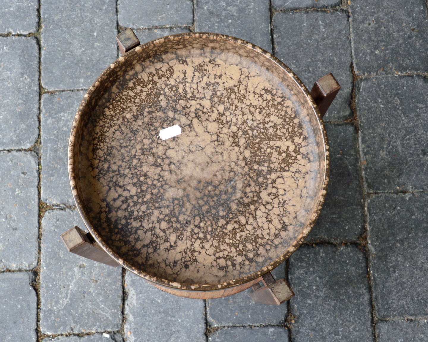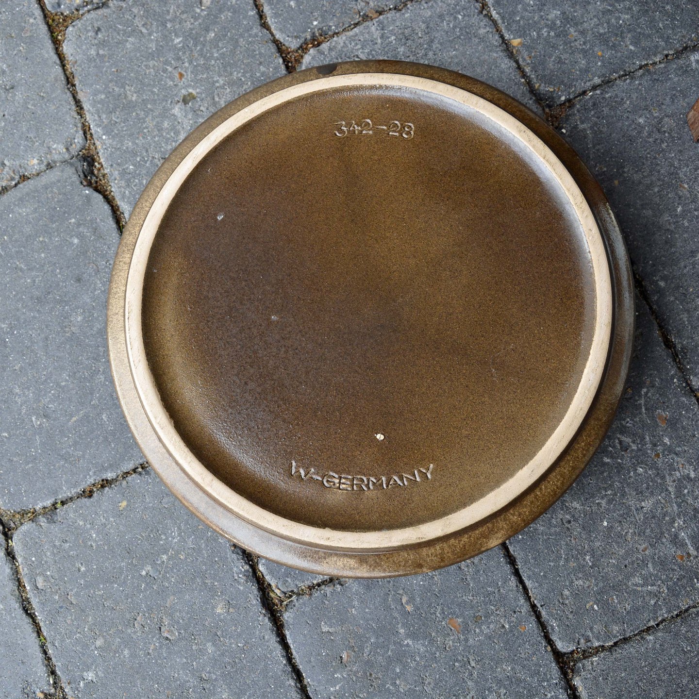 Opsats med stel af teak, hylde og brunmønstret keramikfad fra W. Germany.