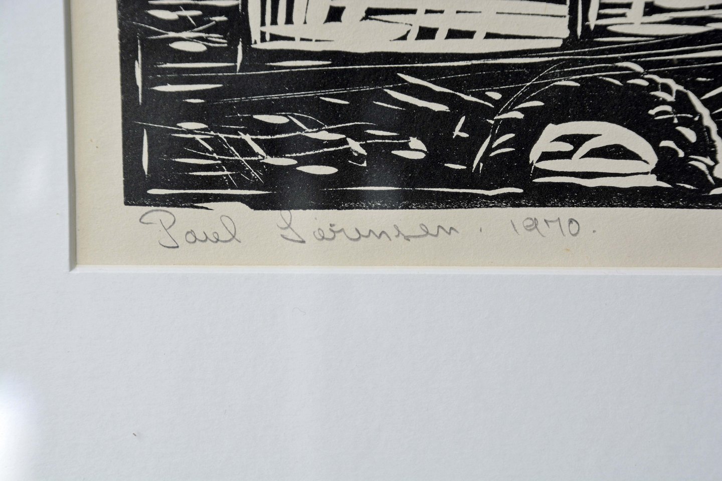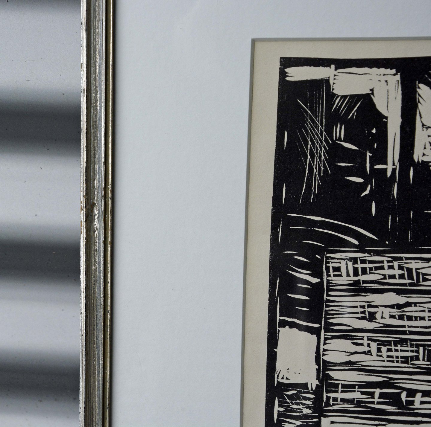 Indrammmet træsnit i sølvmalet træramme med motiv af mænd set bagfra ved fiskekasser