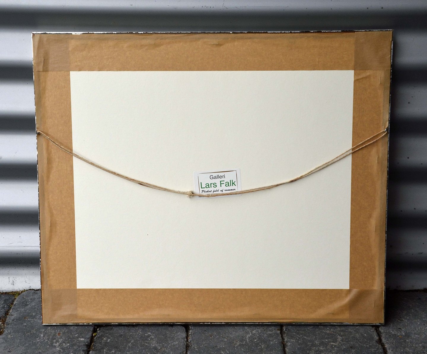 Indrammet træsnit i sølvmalet træramme med motiv af baggård ved fiskerhuse formentlig fra Frederiskhavn