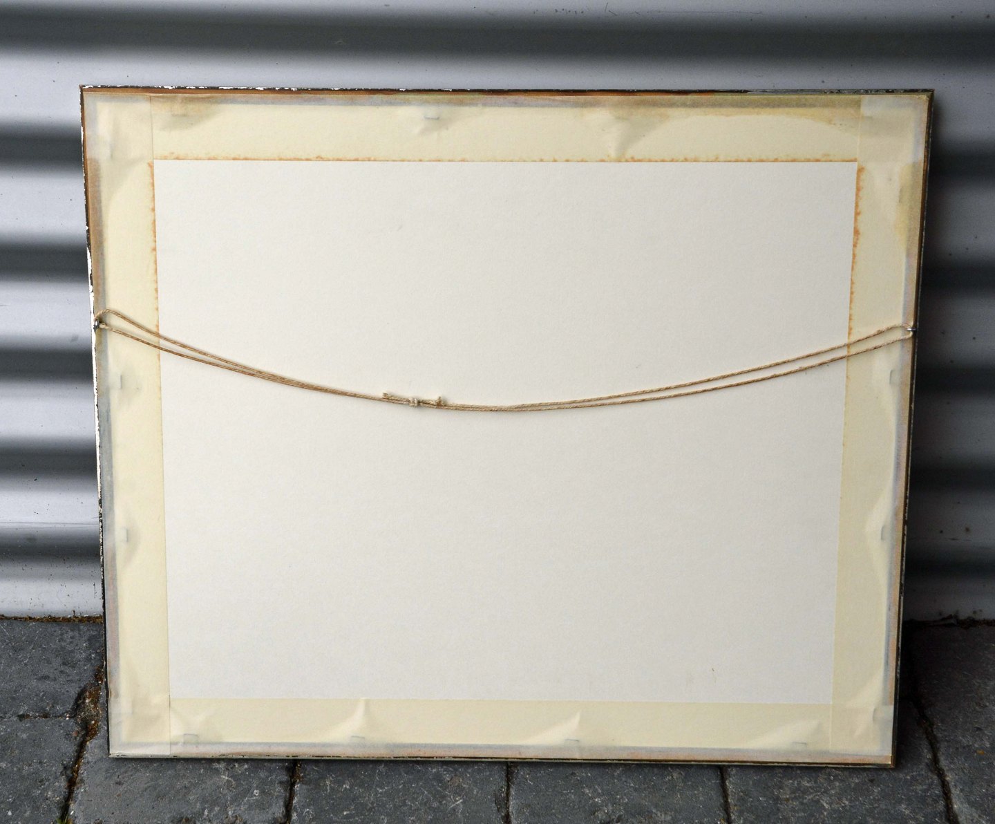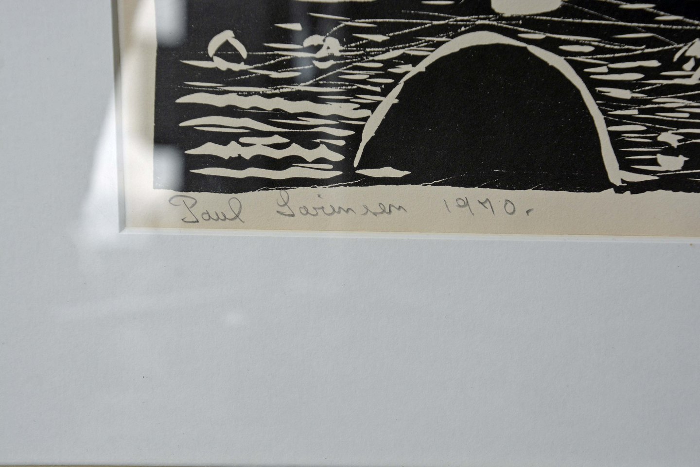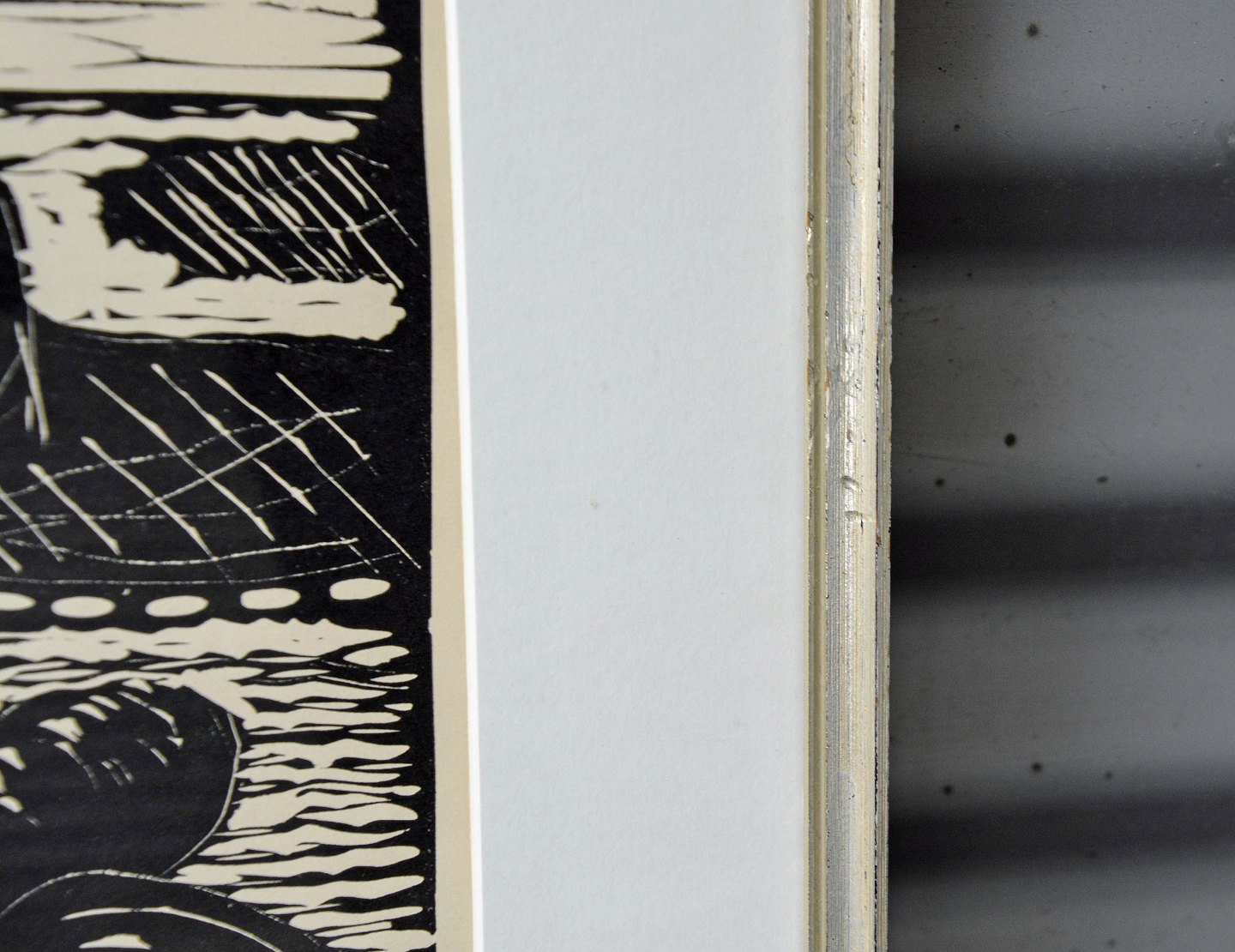 Indrammet træsnit i sølvmale ramme med motiv af redningskrans og bøje
