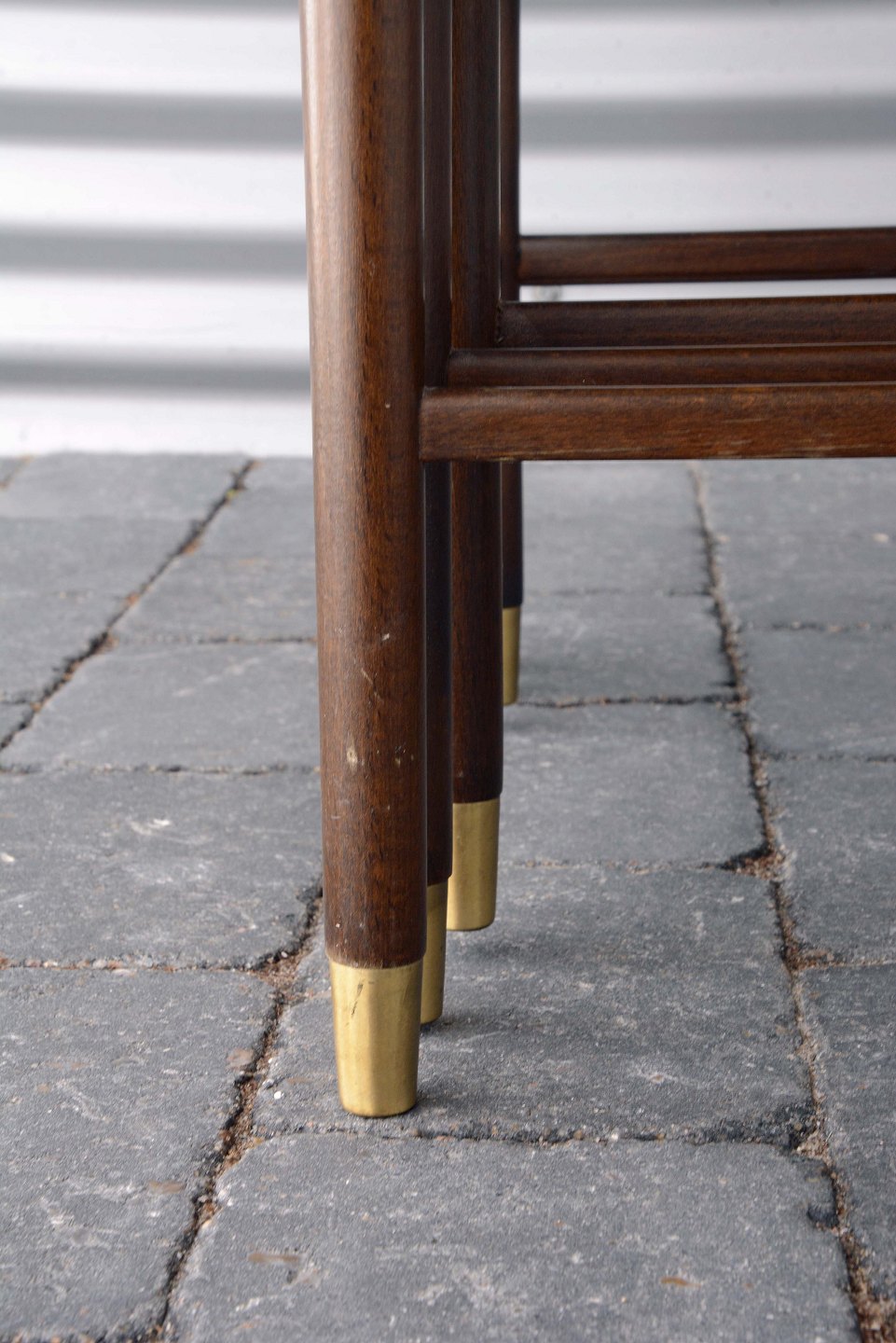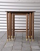 Et sæt indskudsborde i lakeret massivt træ med messingfod. Stellet er lavet af bejdset bøgetræ.