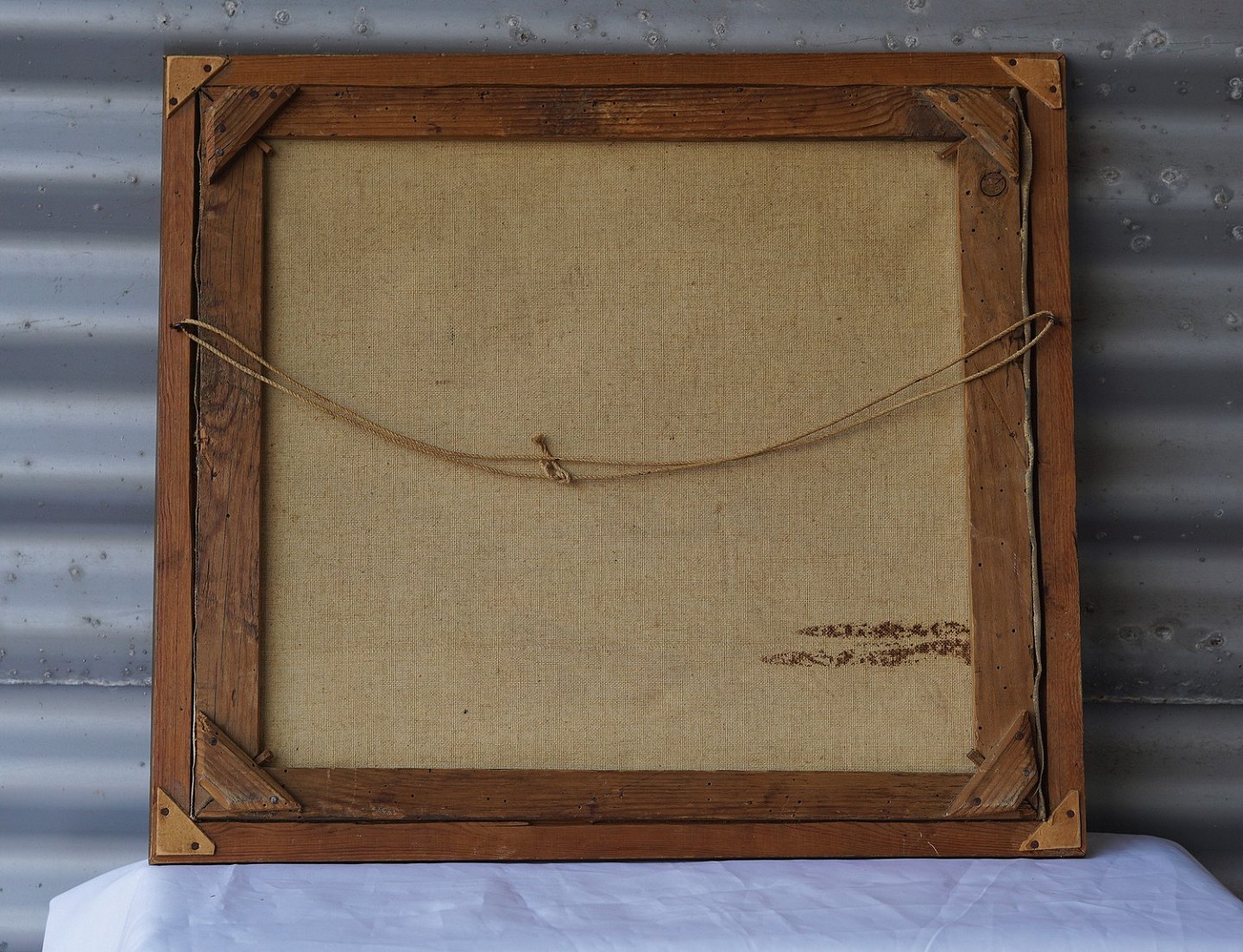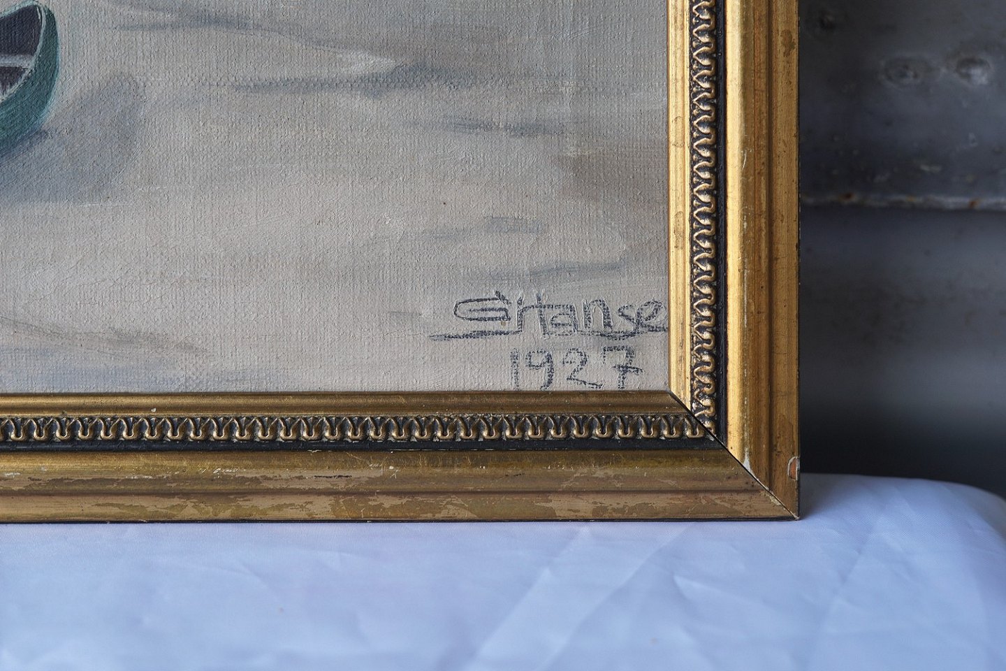 Maleri Strandmotiv med fiskebåde og 2 joller, olie på lærred