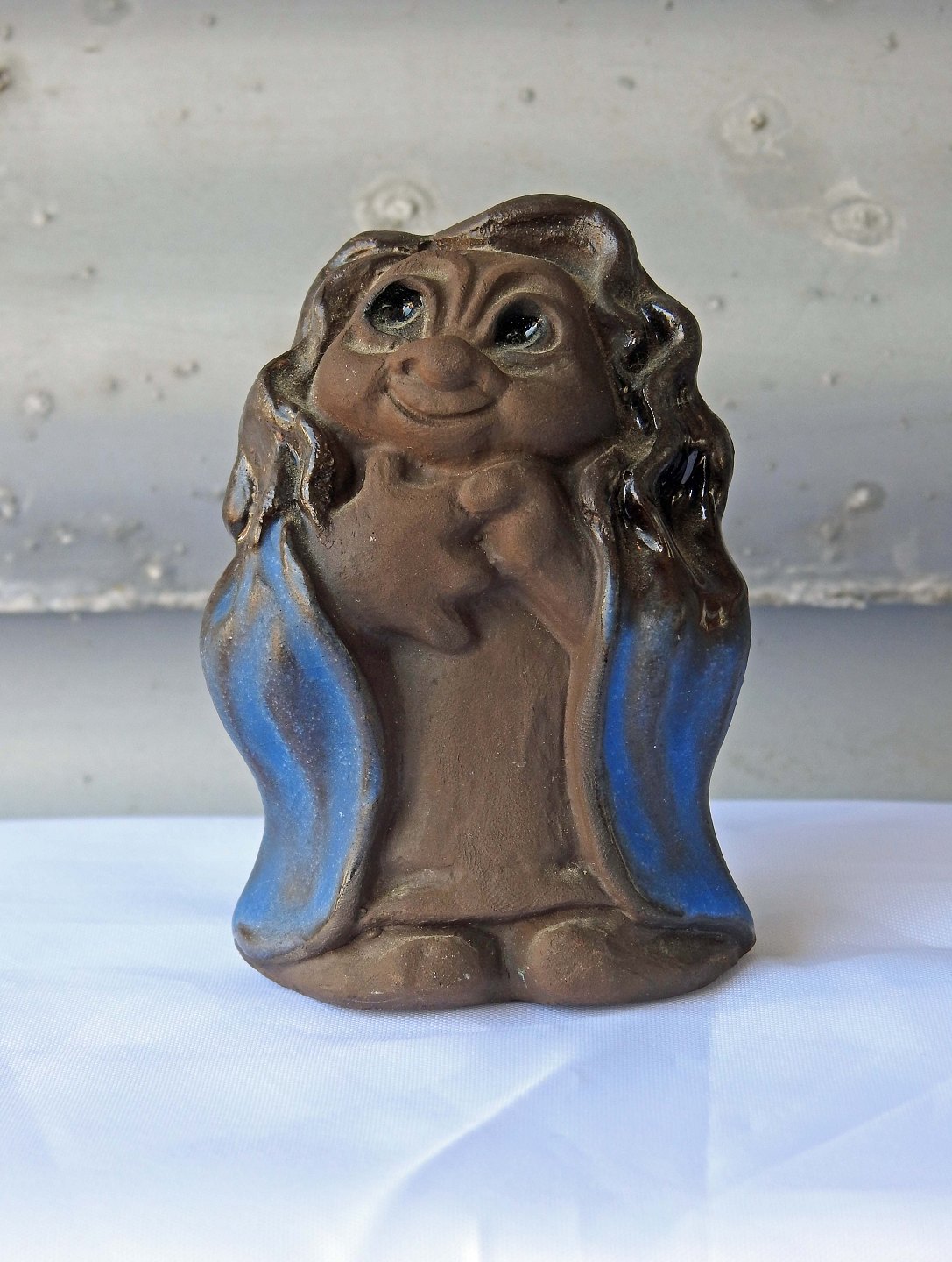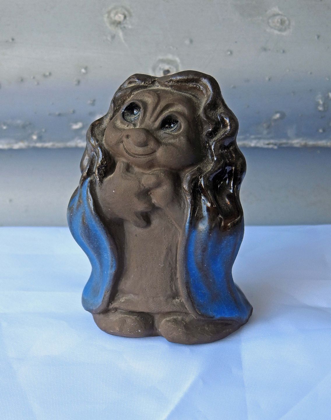 Dam trold i keramik med motiv af Troldepige med blå kappe