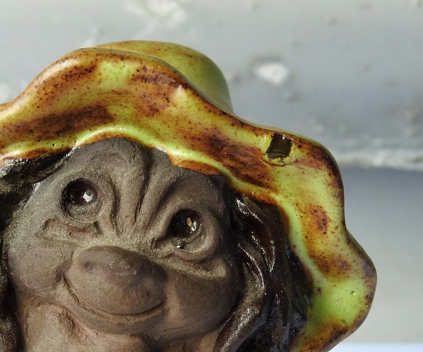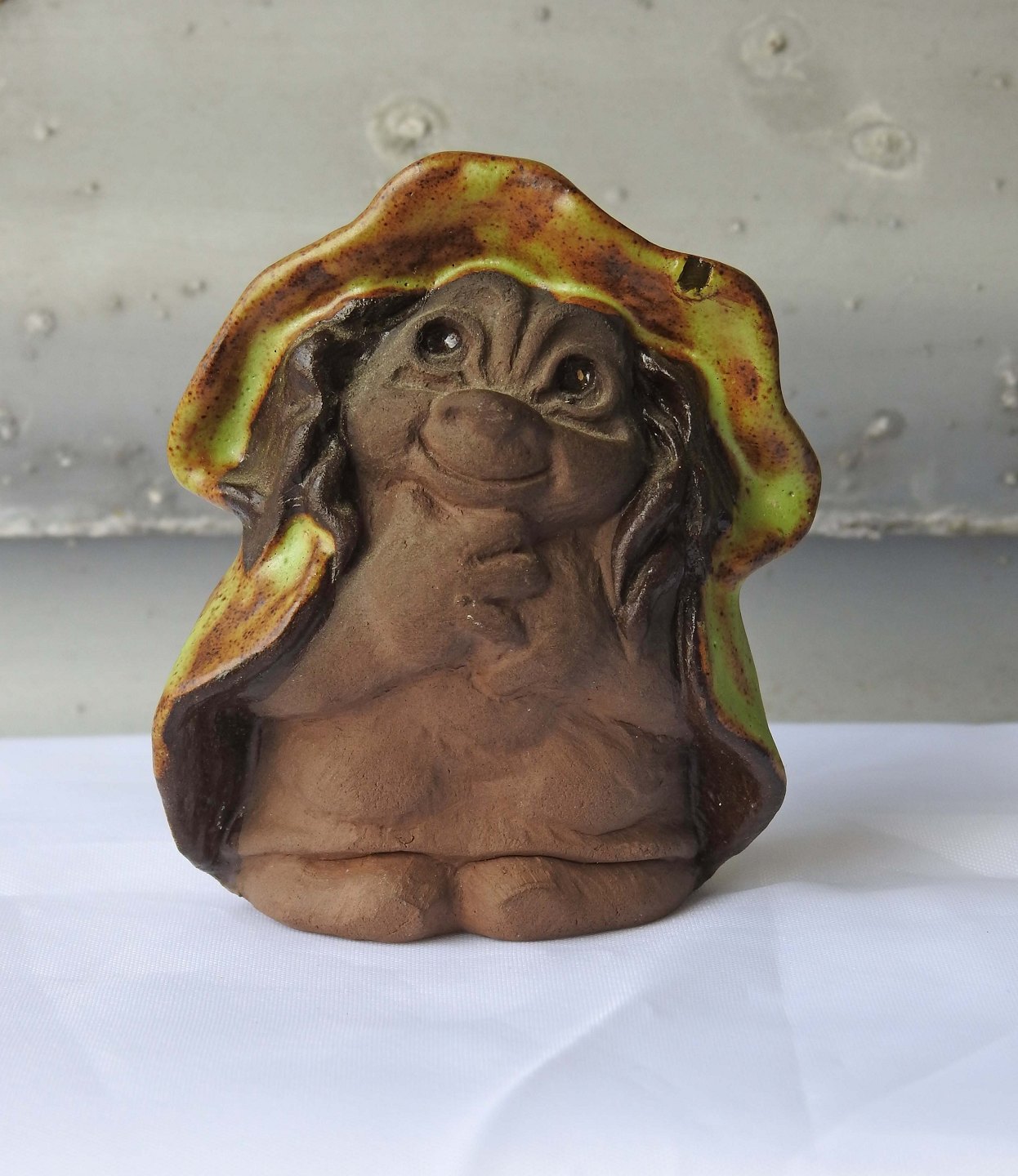 Dam trold i keramik med motiv af Troldepige med gul kappe og afrundet hattekant