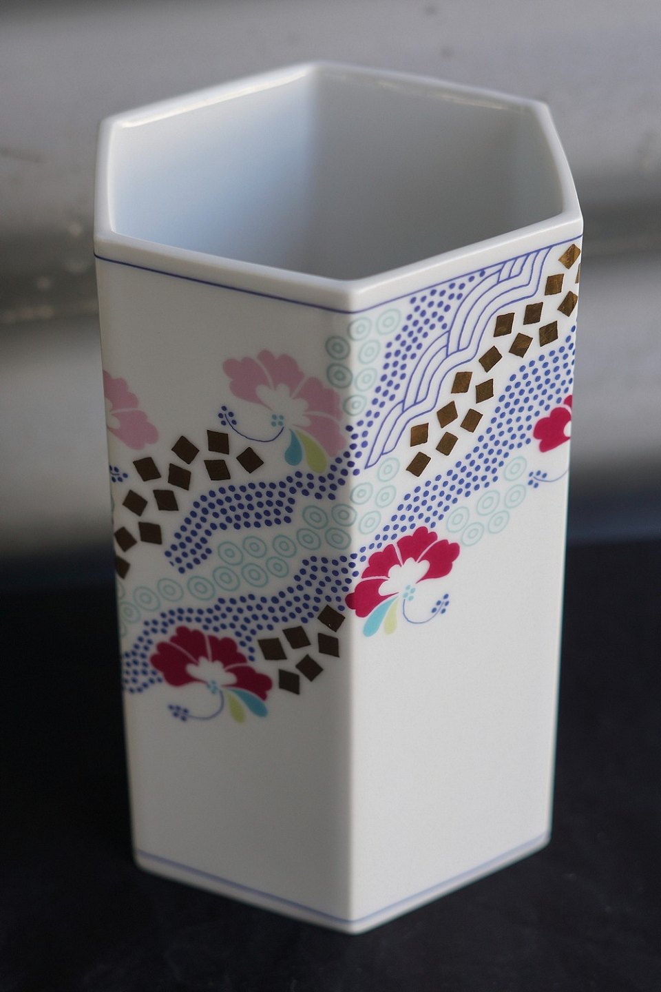 6-kantet vase (1827/5472). Porcelæn dekoreret med trykt motiv og guld
