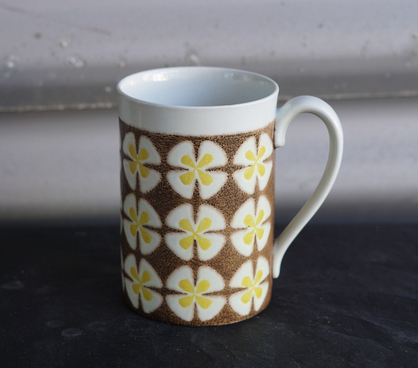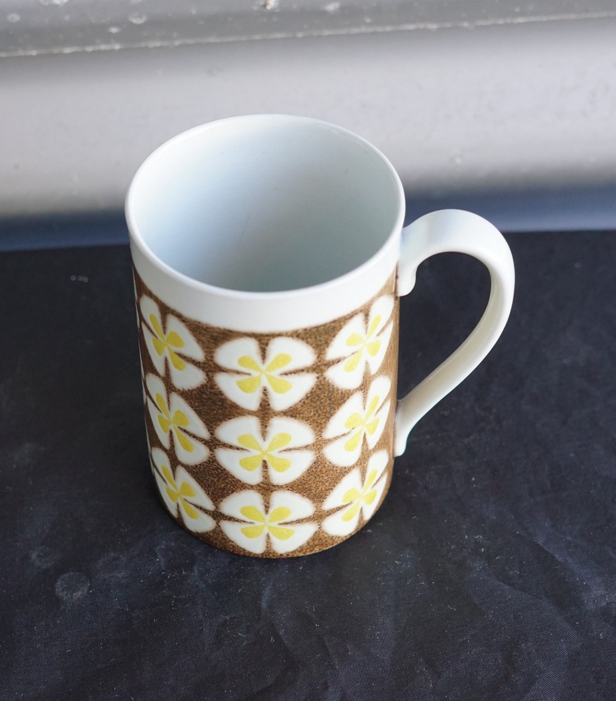 Kongelig fajance Baca krus dekoreret med gule blomster og brune firkanter