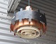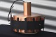 Kobberpendel med krone af sort metal, med plastik lysdæmper i lampens nederst kant