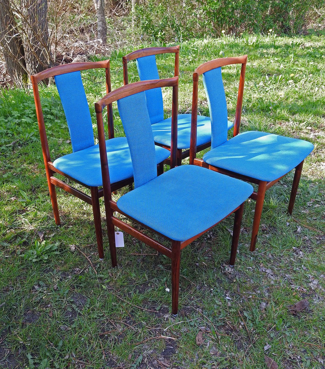 Et sæt på 4 stole i palisander med turkis stofbetræk på ryg og sæder