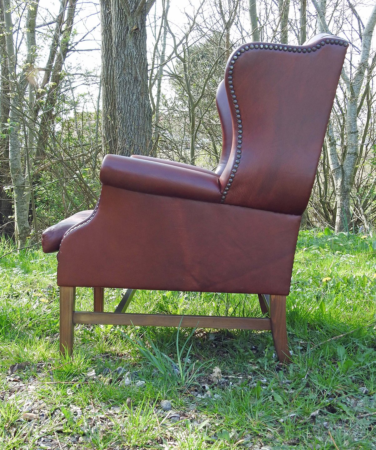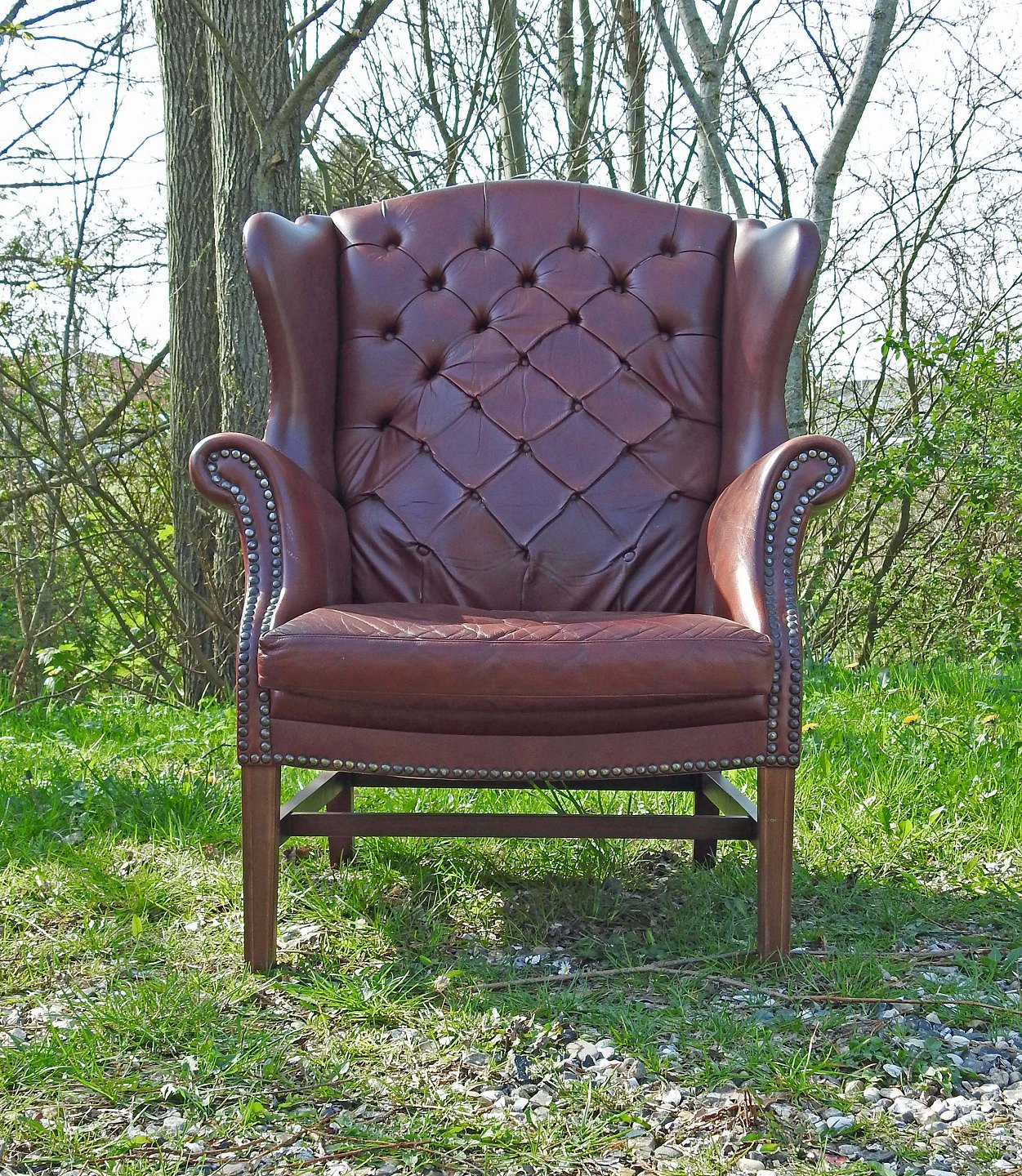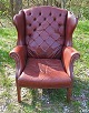 Øreklapstol, lænestol, højrygget stol, læderstol, chesterfieldstol, brun læder stol, herrestol, armstol