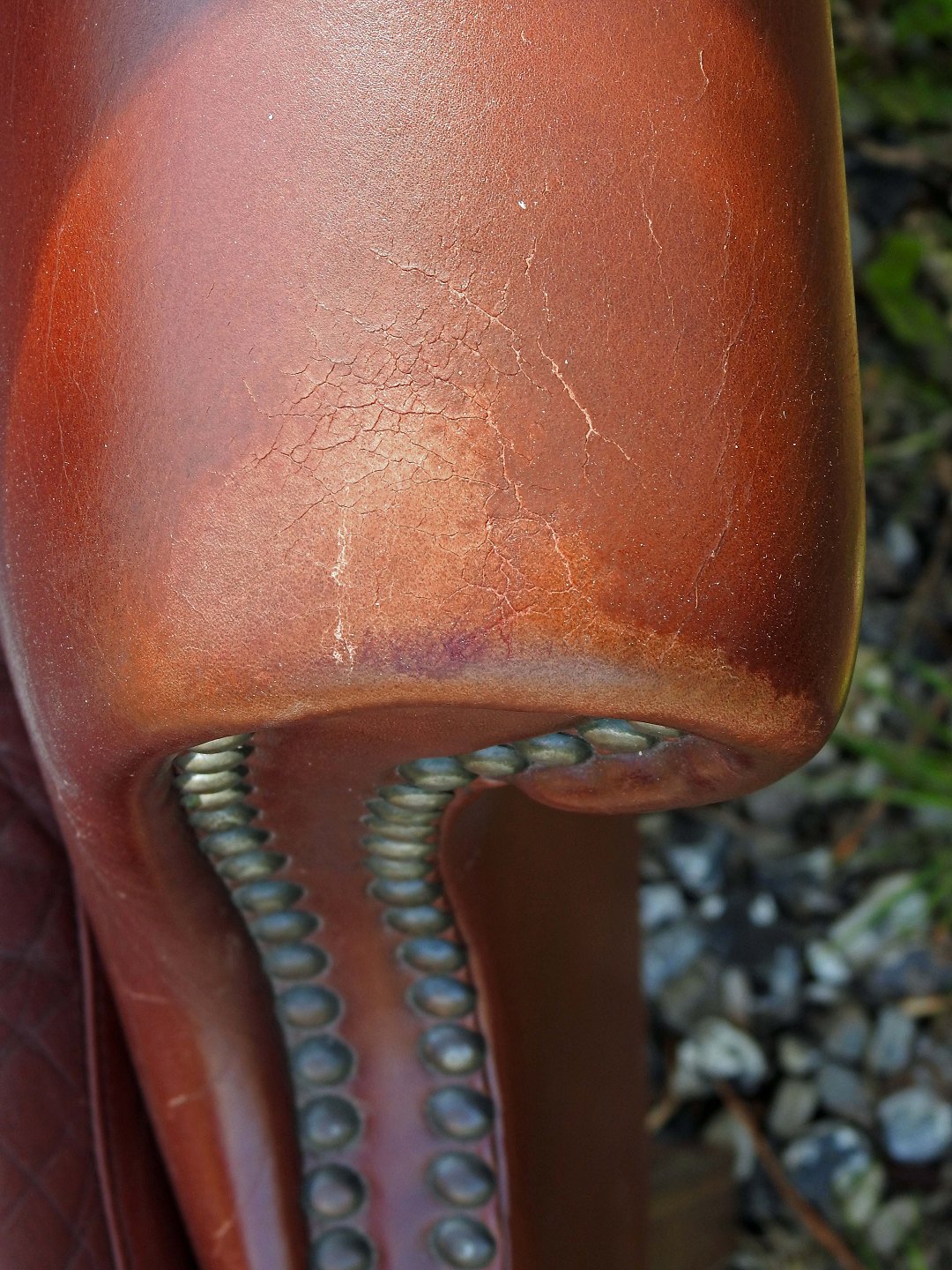 Stolen fremstår med patina og enkelte ridser på læderet ved armlæn.