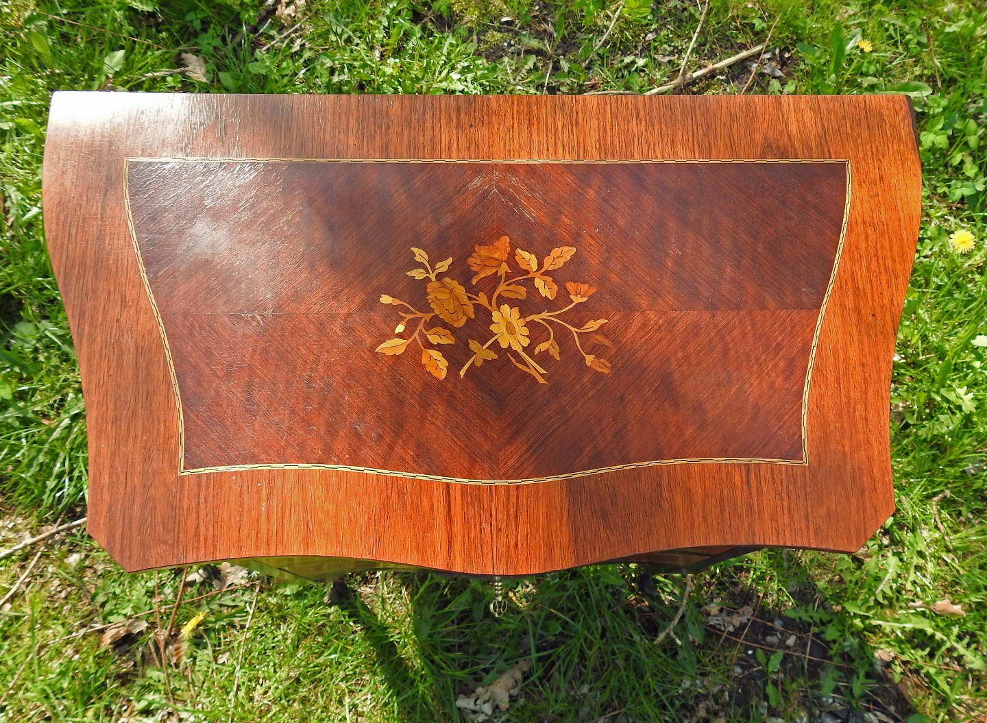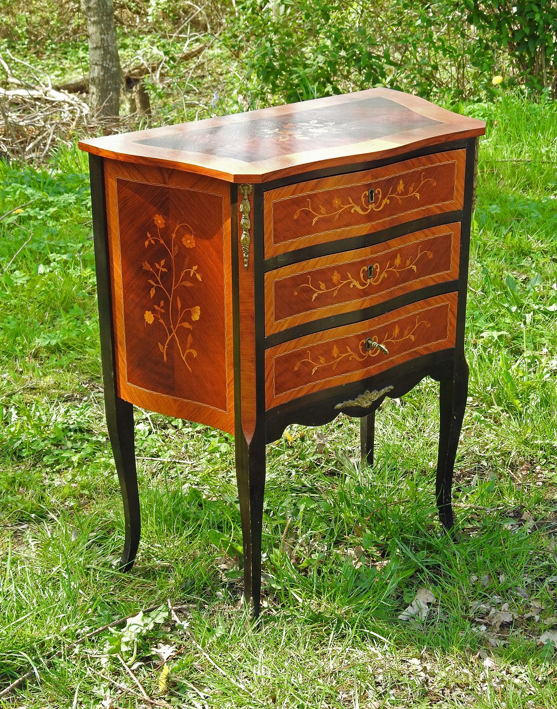 Lav lakeret kommode med 3 skuffer, nøgle og intarsia i flere træsorter
