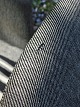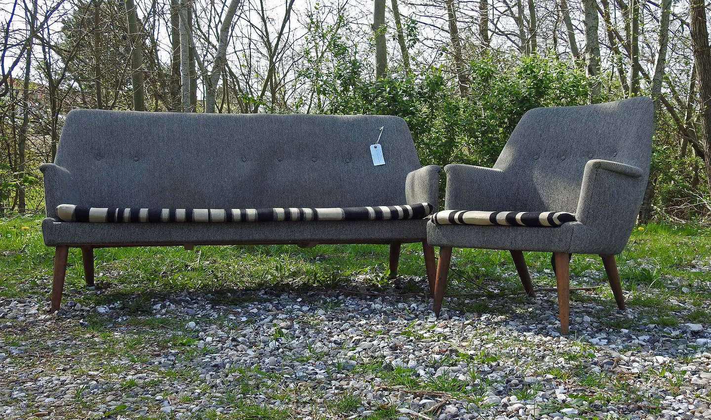 Møbelsættet er med originalt stofbetræk i uld med mønstret hynder i sort, hvid grå på gråmeleret møbel med ben i mørk olieret egetræ