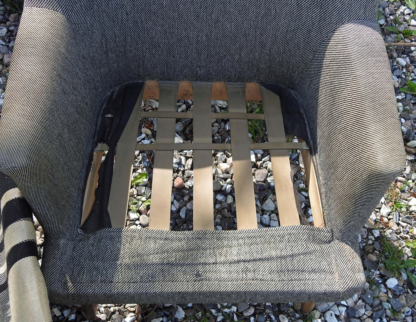 Fremstår med lettere slid på stof ved armlæn samt en mindre revne i stoffet på stolens top. Lettere brugsspor på ben.