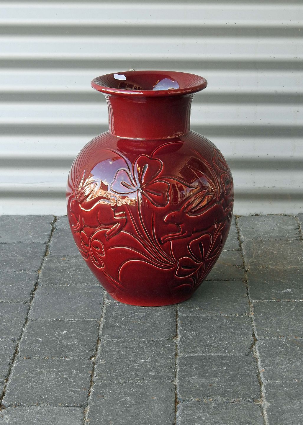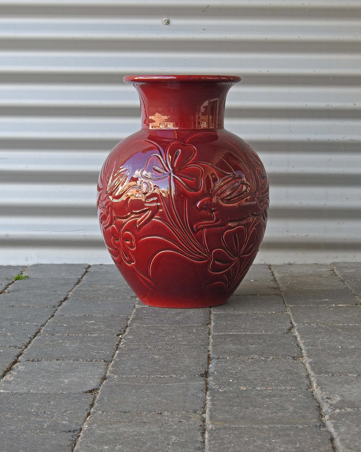Gulvvase i keramik med okseblodsfarvet glasur og motiv af harer og blomster