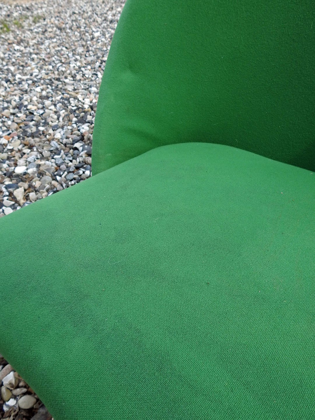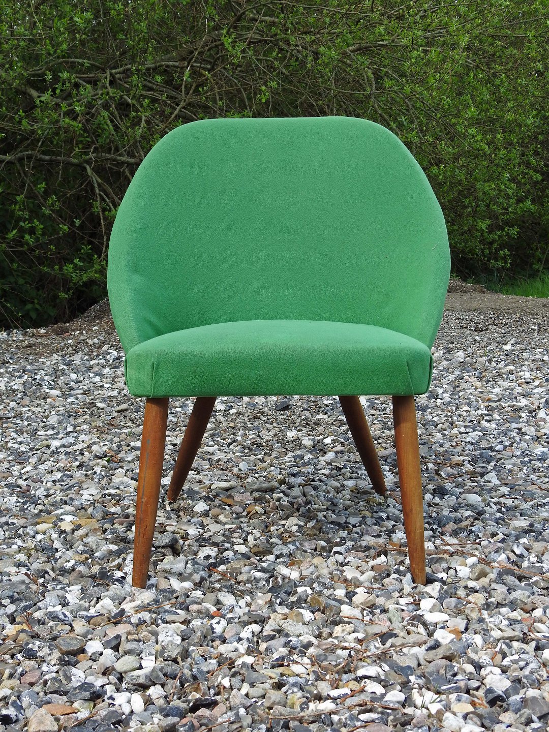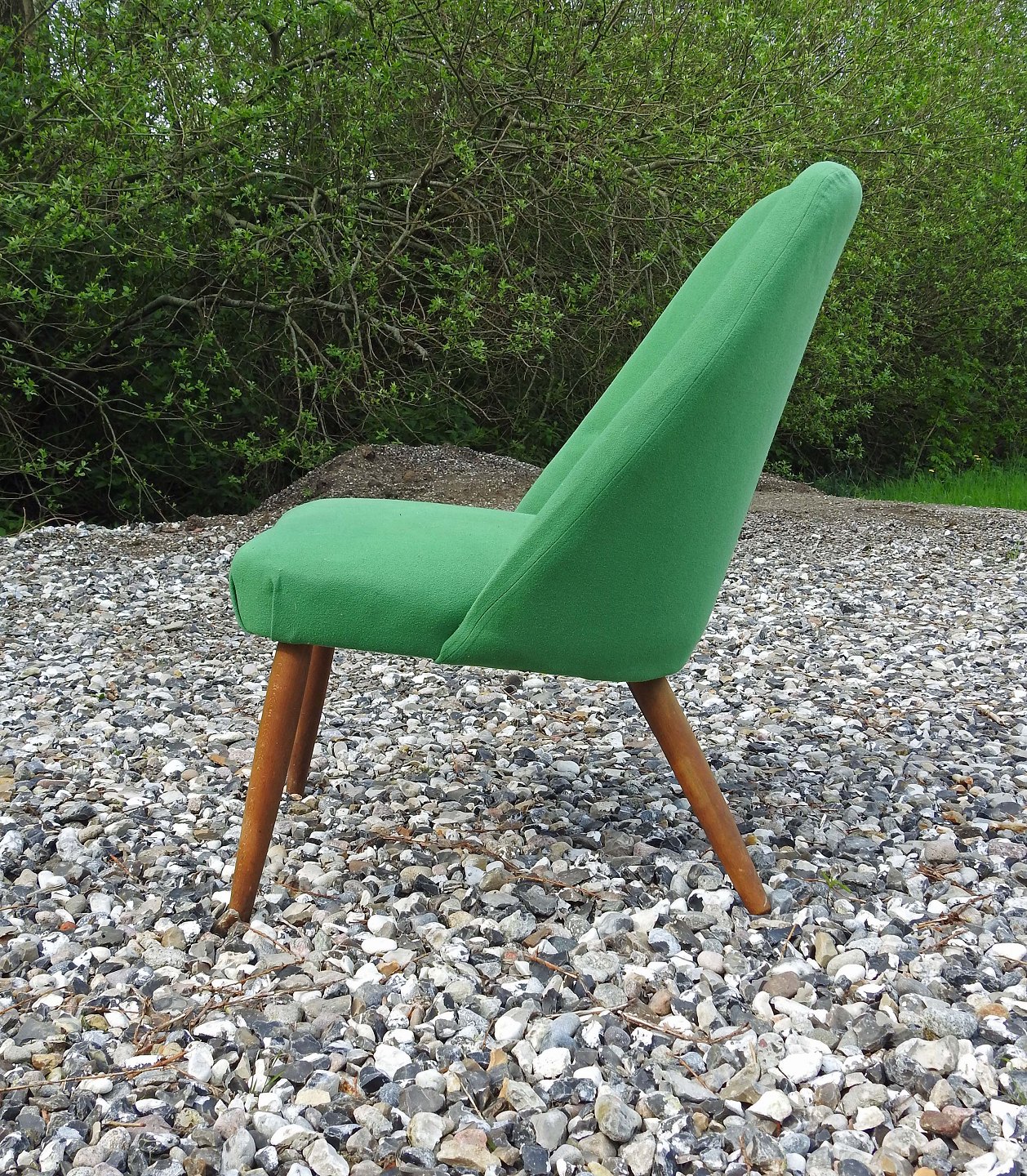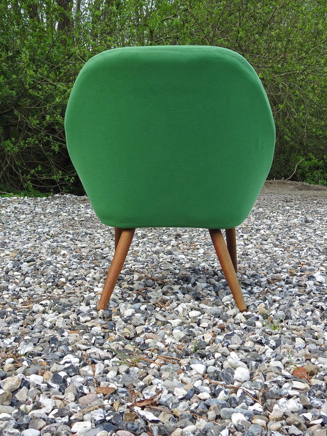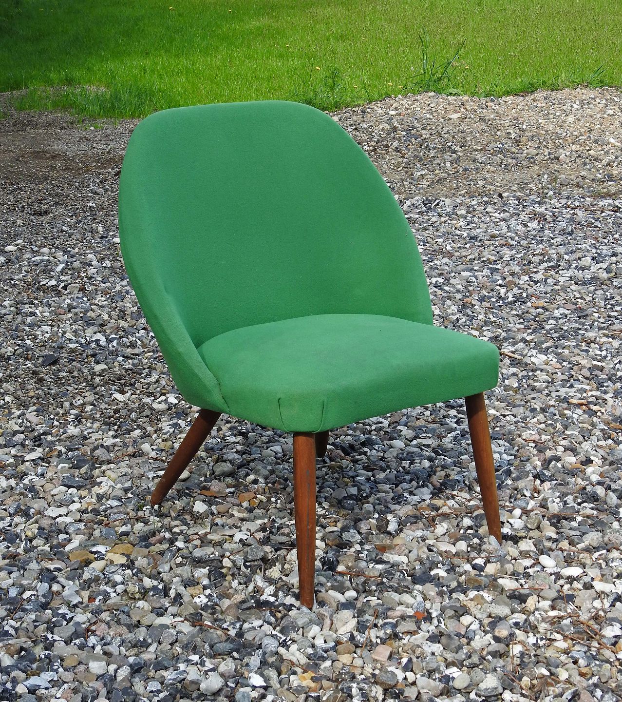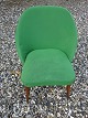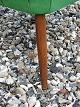 Grydestol i teaktræ med kantet sæde og grøn stofpolstring
