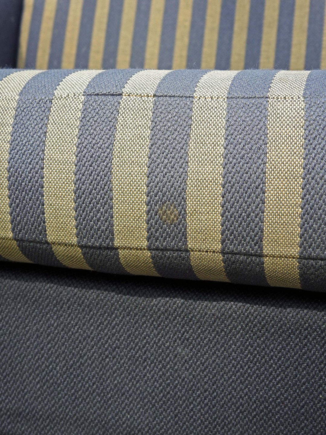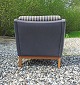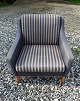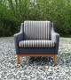 Lænestol med stel i egetræ med stofpolstret hynder i blå og råhvide farver