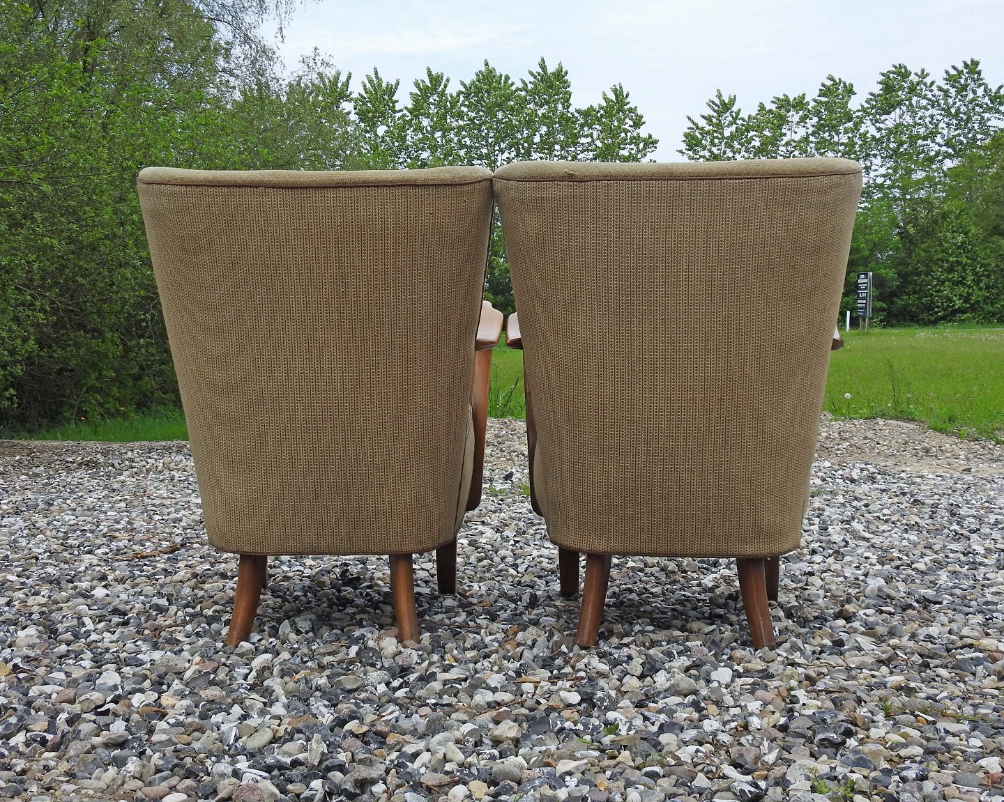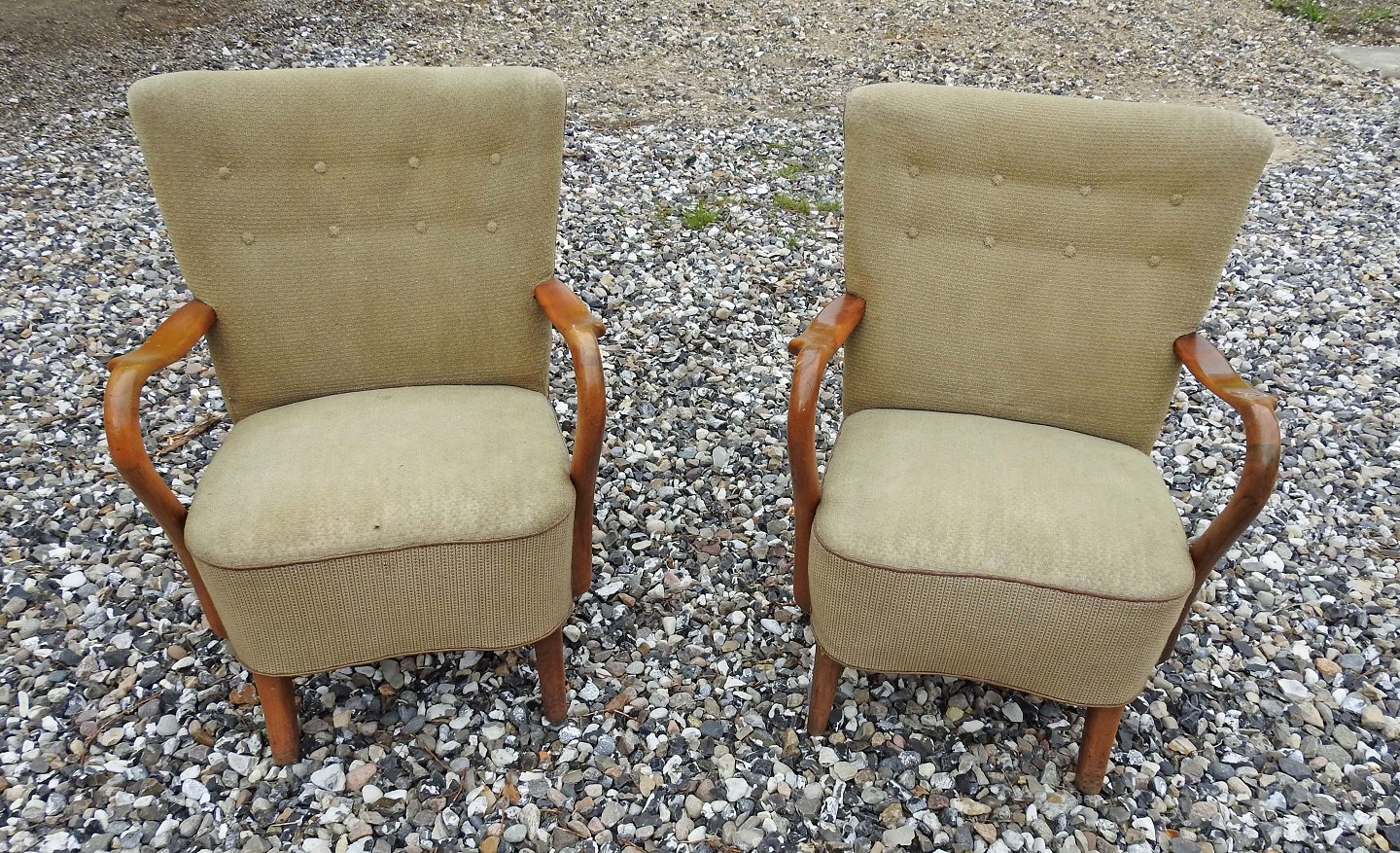 Et sæt lænestole i bejdset bøgetræ med svungne armlæn og polstret af Alfred Christensen