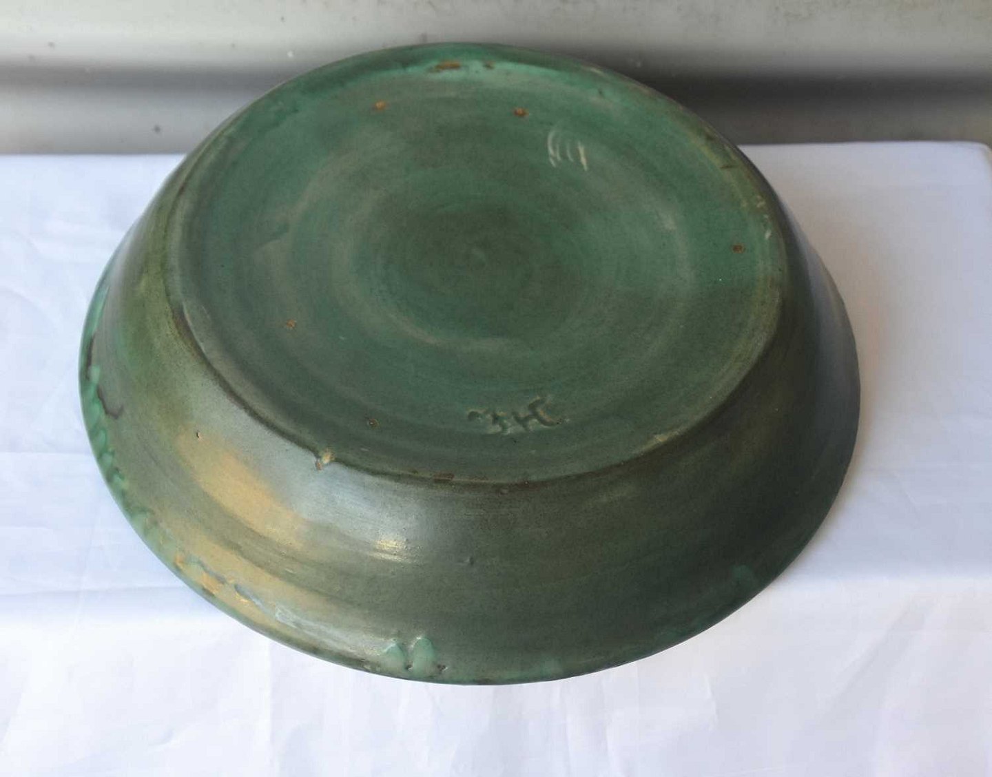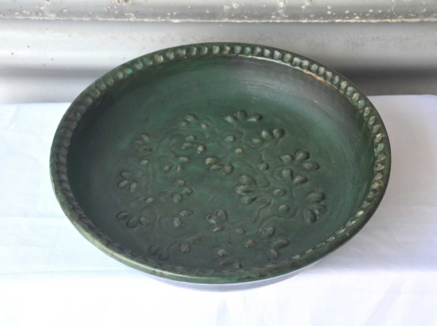 Grønt keramik fad, med blomstrer lignende figur i bunden