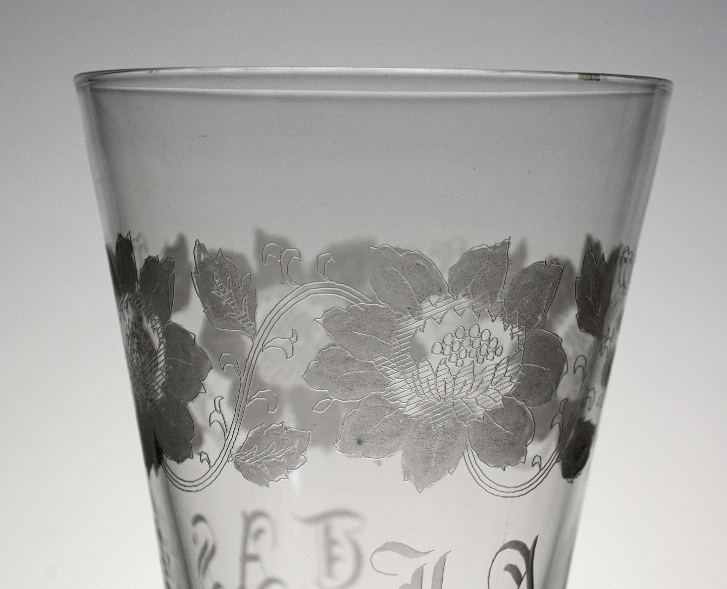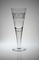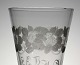 Pokalglas med blomster, bogstaver og dato 11-11-22. Glasset er glattet i bund. En ring af små luftbobler under kummen. Se figur 163 hvid glasbog. Kastrup Glasværk.