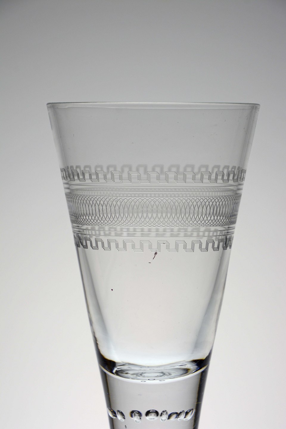 Pokalglas med guillocherede bort, formentlig fra Holmegaard, glatte bund og bobler under kumme.