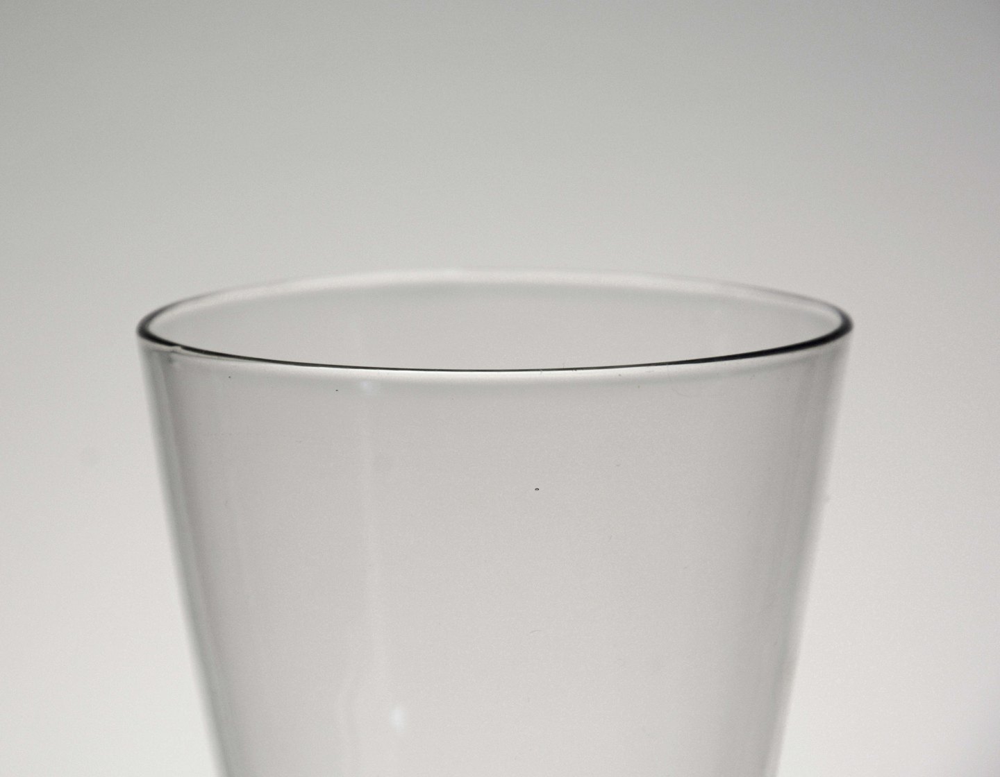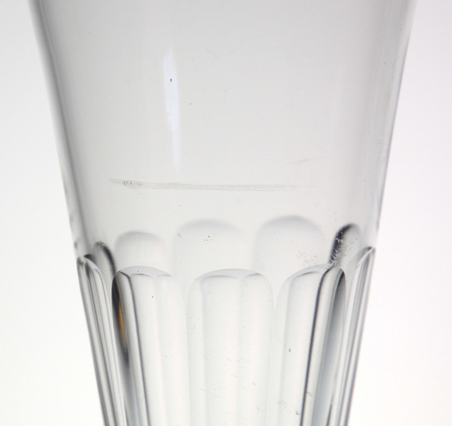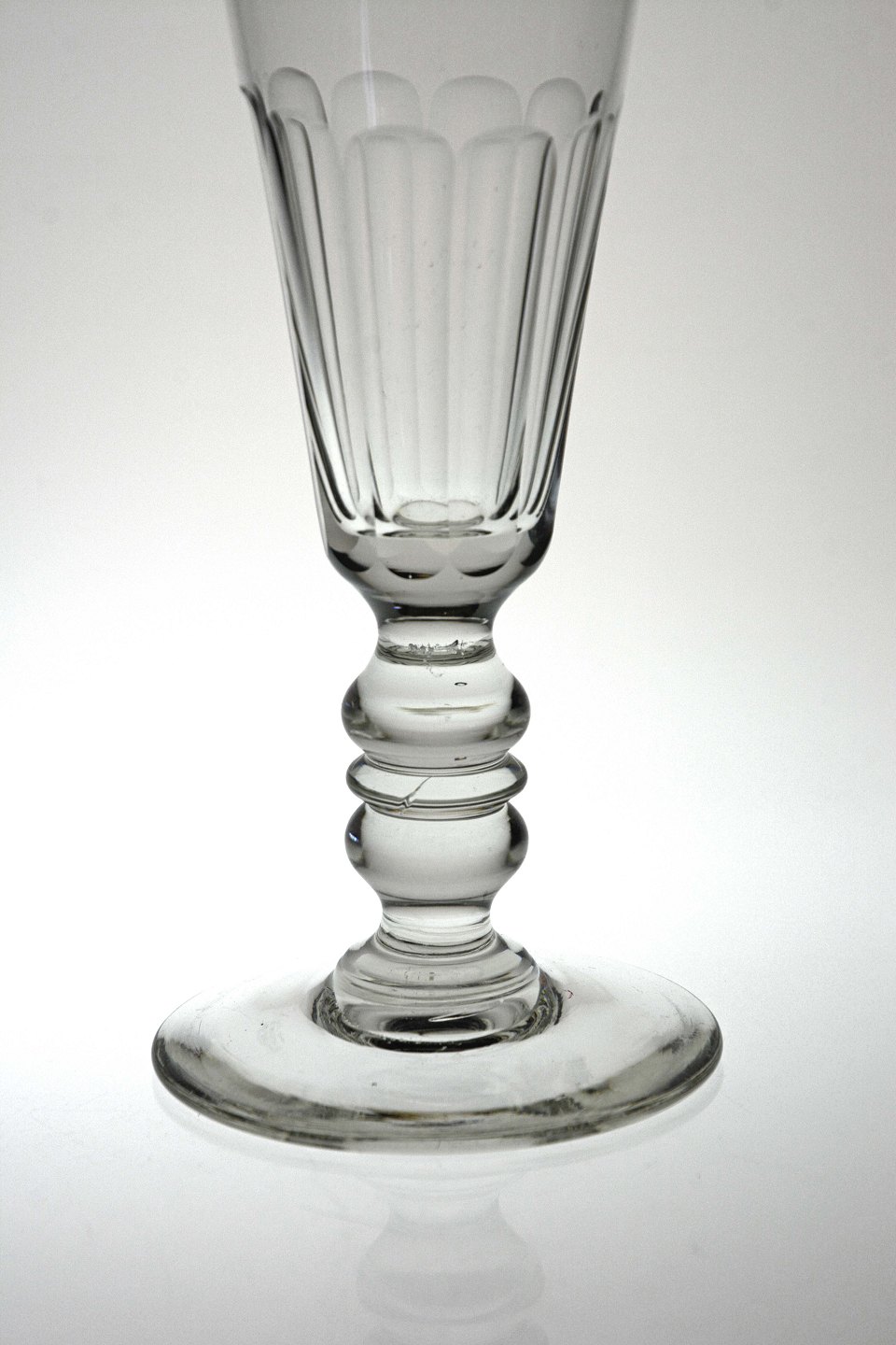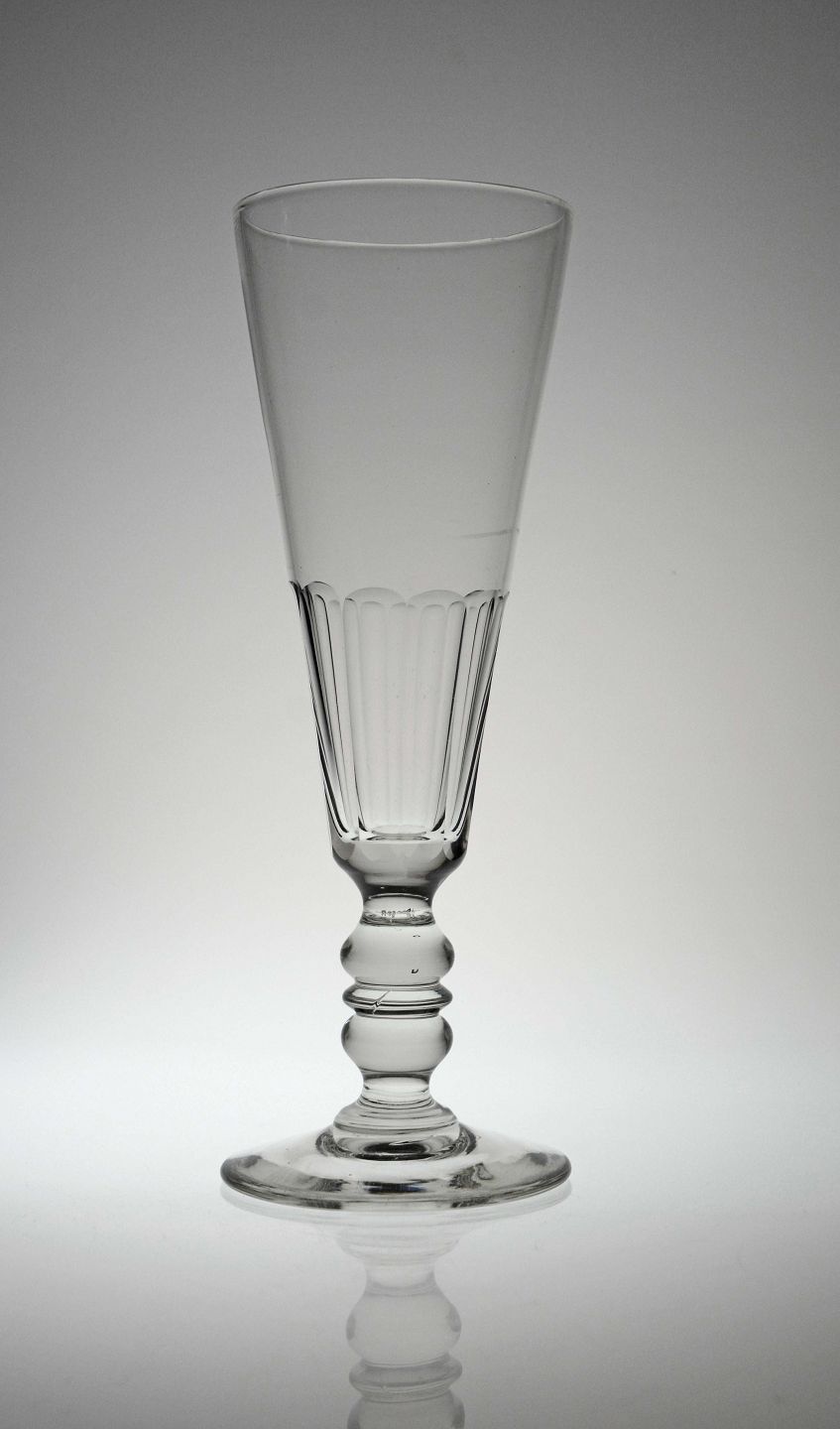 Pokalglas i campagne glas form, tre ringe på stilk og kugleslebet. Ligende glasform er i Holmegaard prøvesamling, se fig 166 hvid glasbog.
