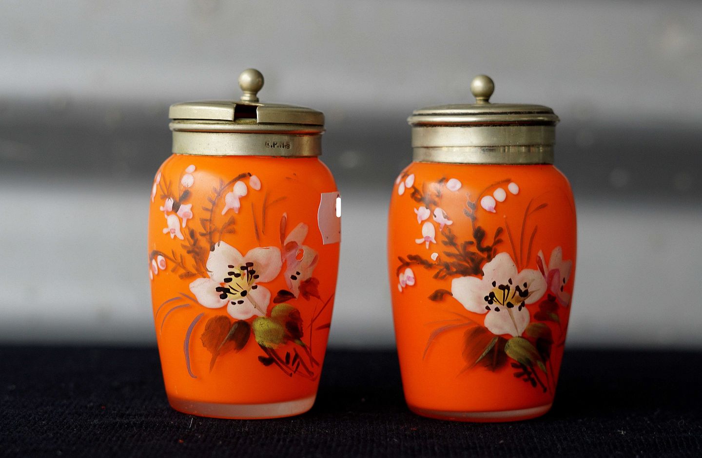 Sennepskrukke og strødåse i orange glas, bemalet med hvide blomster