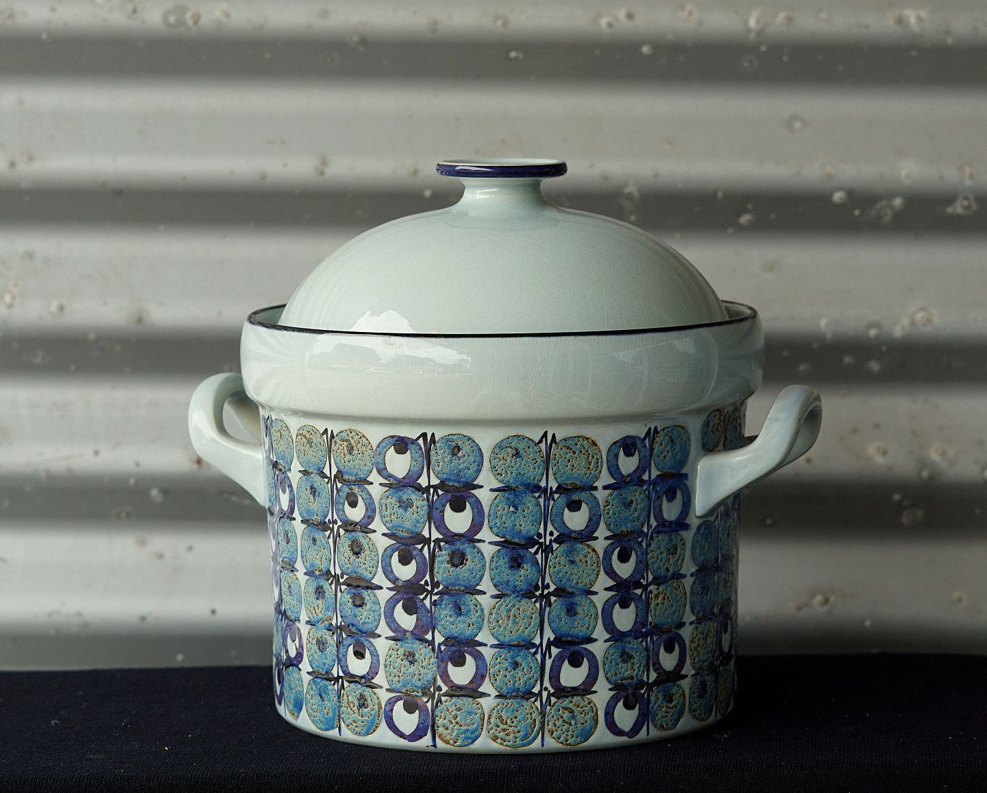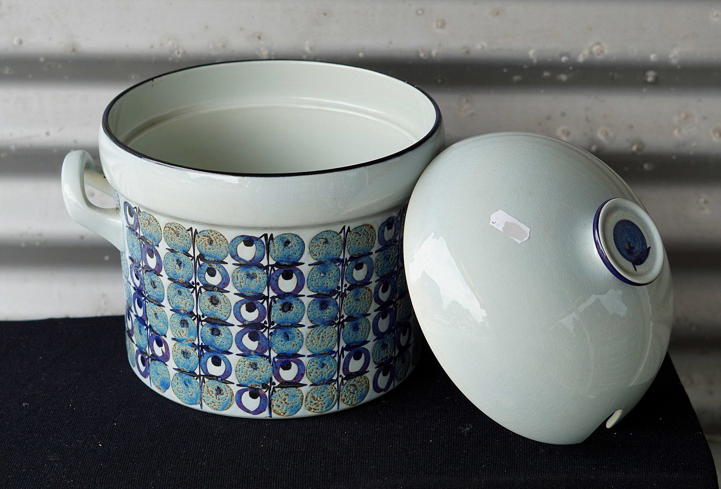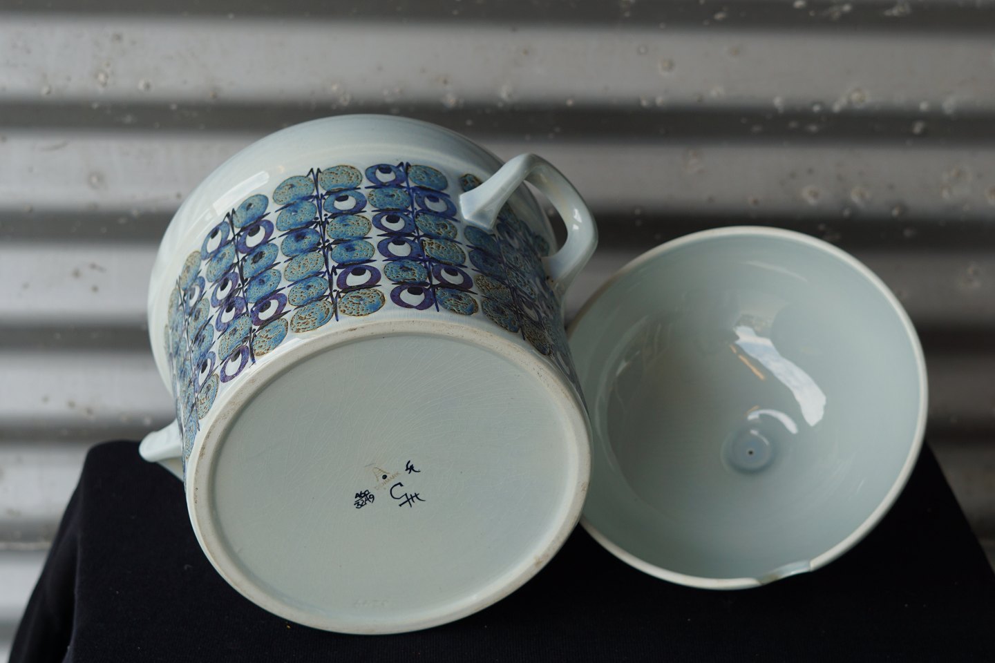 Aluminia terrin med låg og ske i fajance fra serien Tenera nr. 460/3249 og 448/3274