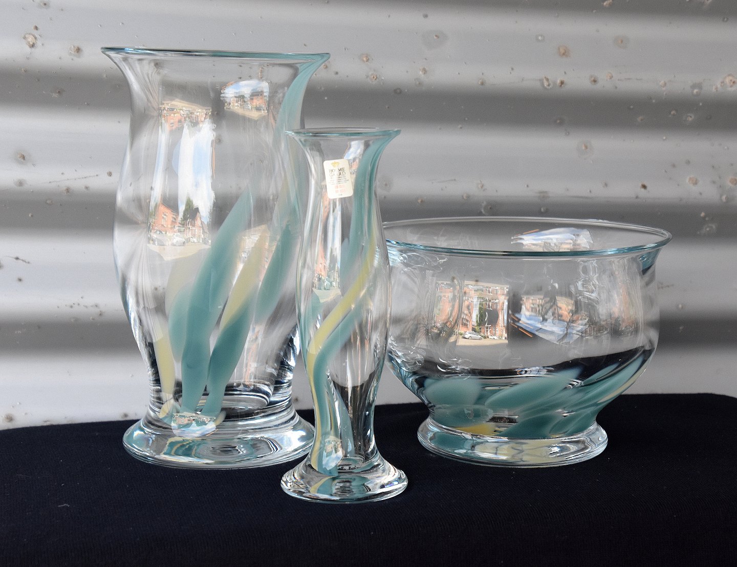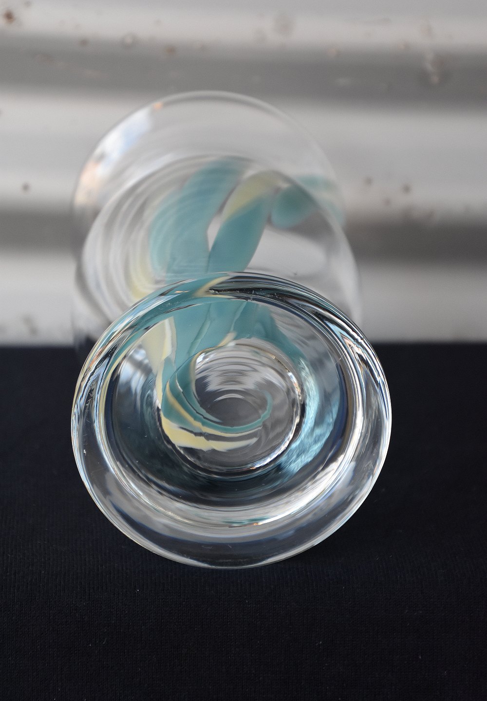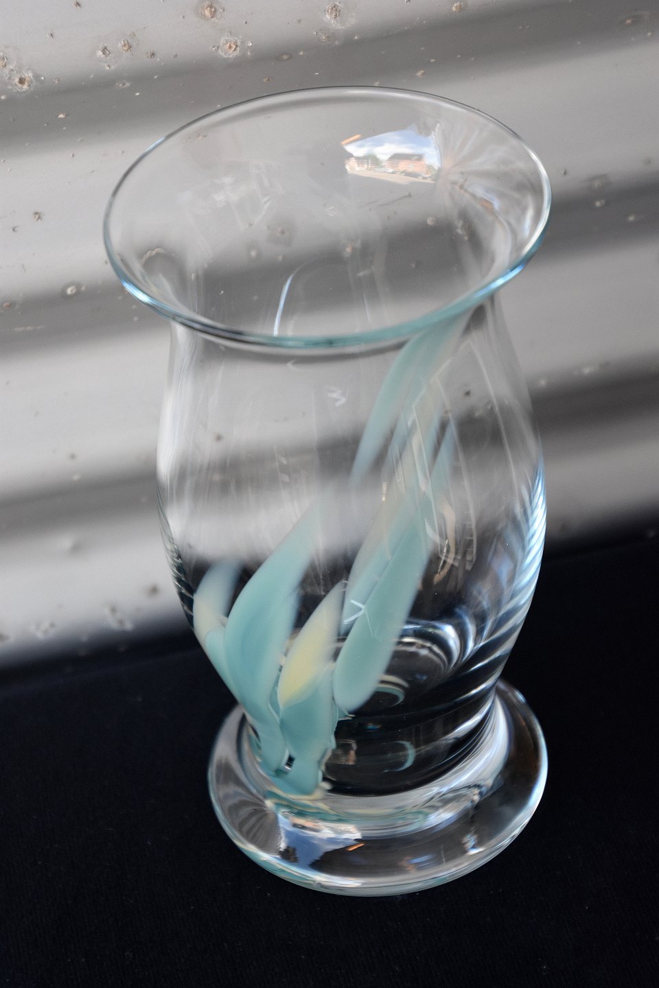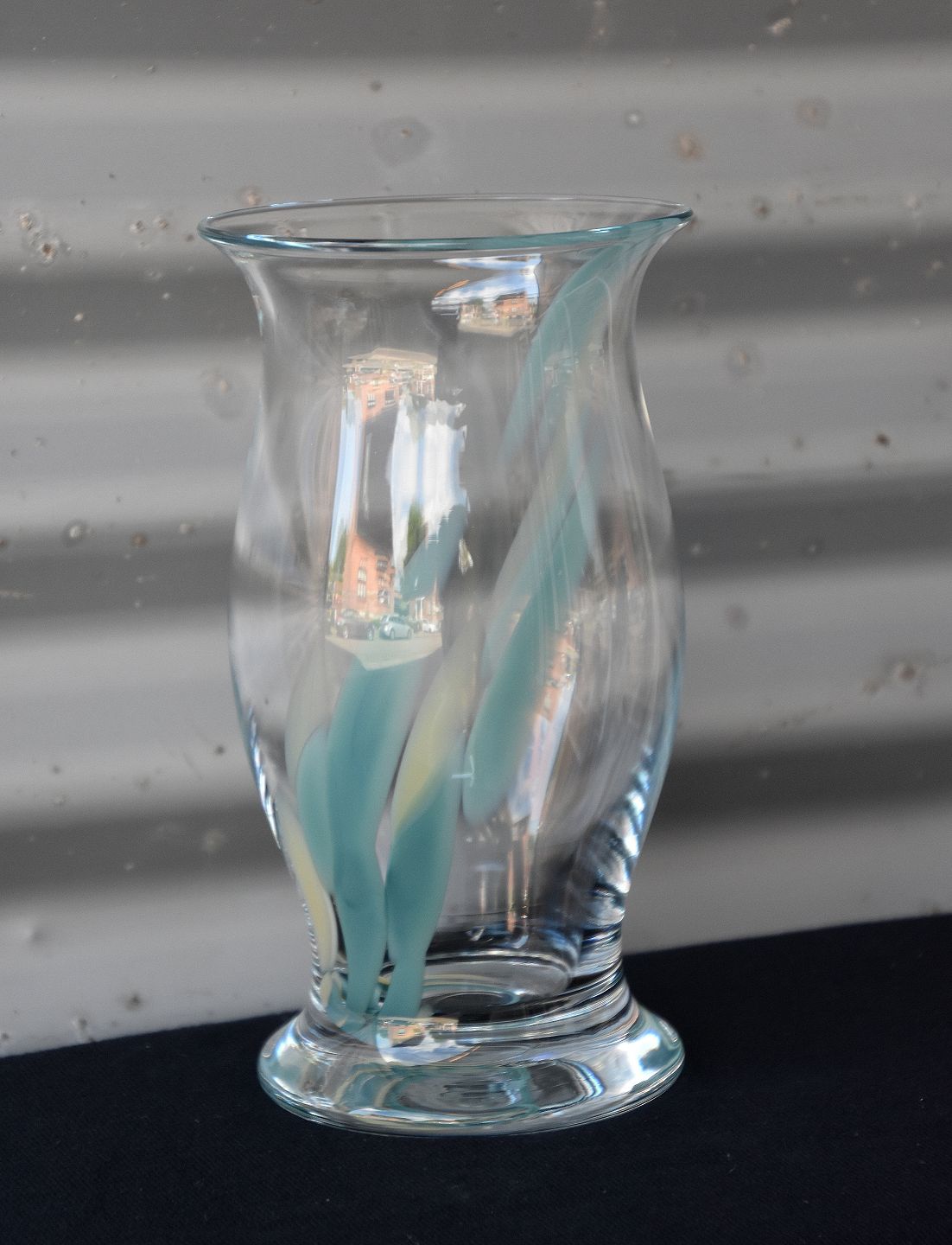 Harmony vase med udsvejet hals og udsvunget massiv fod. Blæst i klart glas med indlagt gule og grønne skål