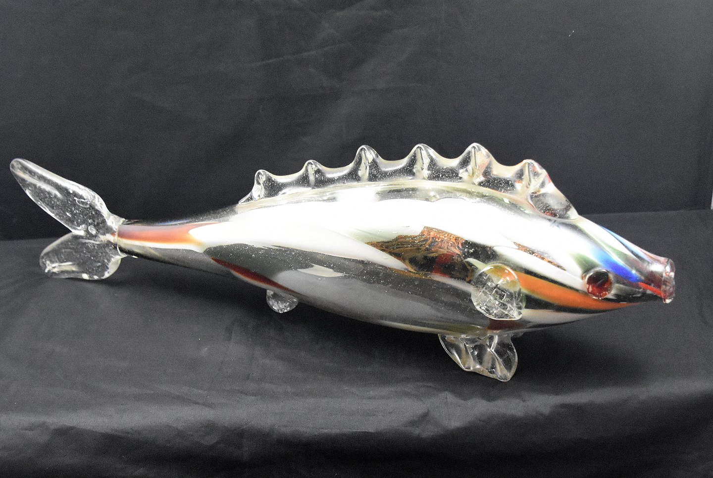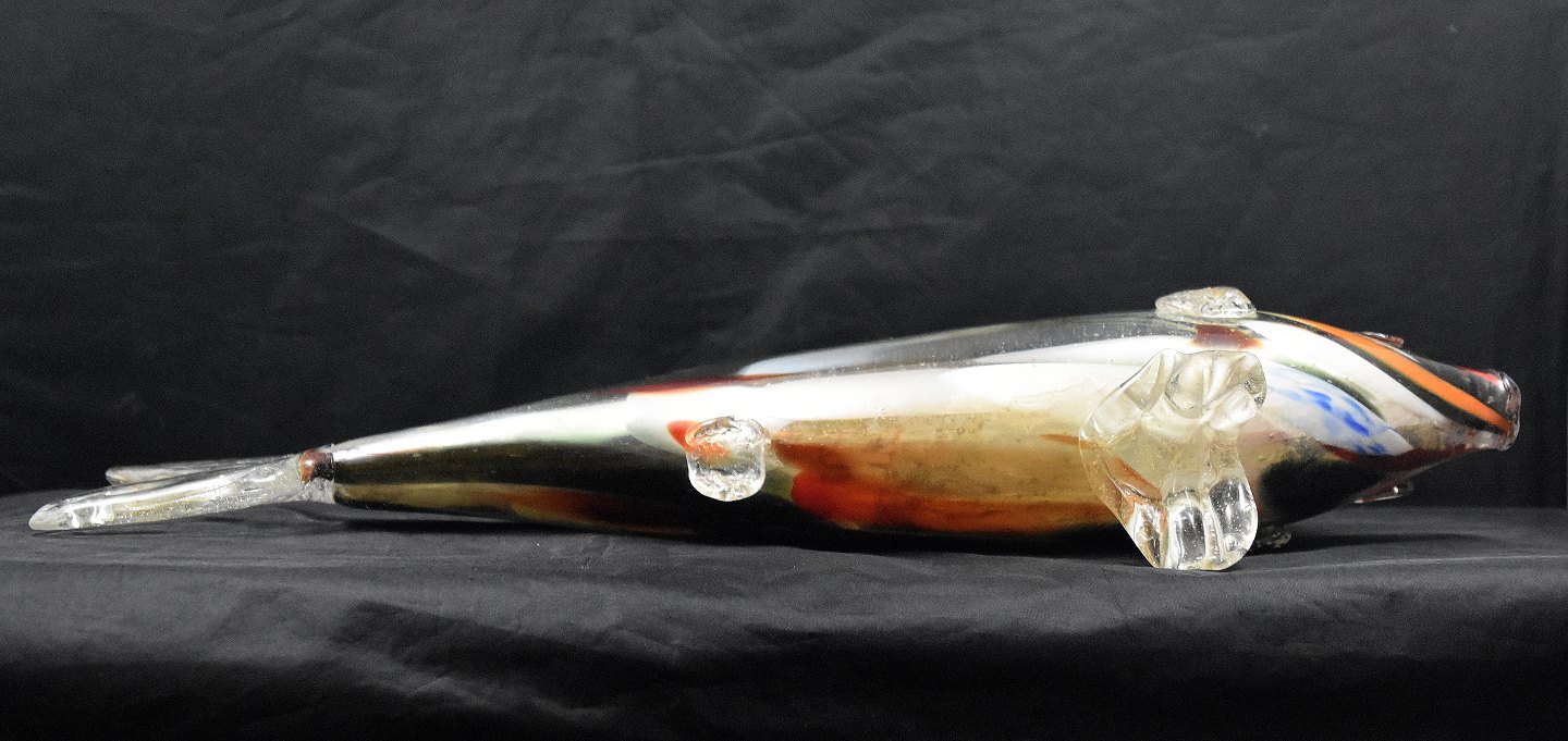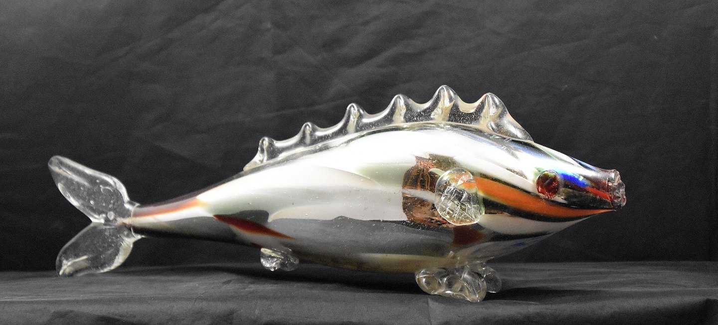 Smuk multifarvet fisk fremstillet på Murano Glasværk, Italien. Fisken er fremstillet af resteglas. Multifarvet fisk med klart overfang