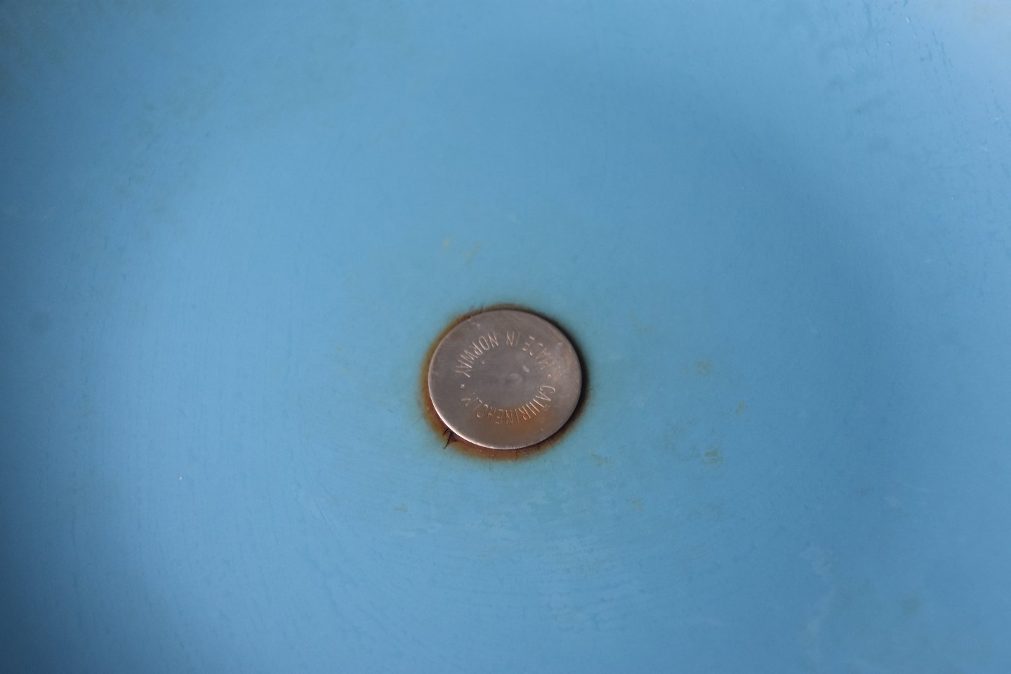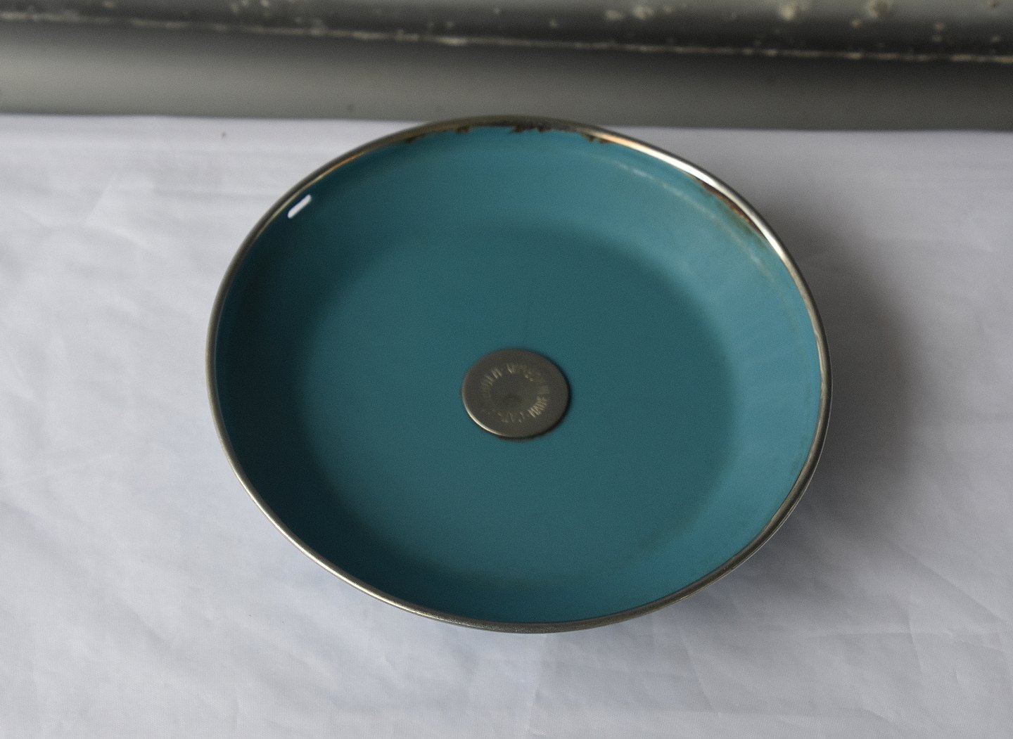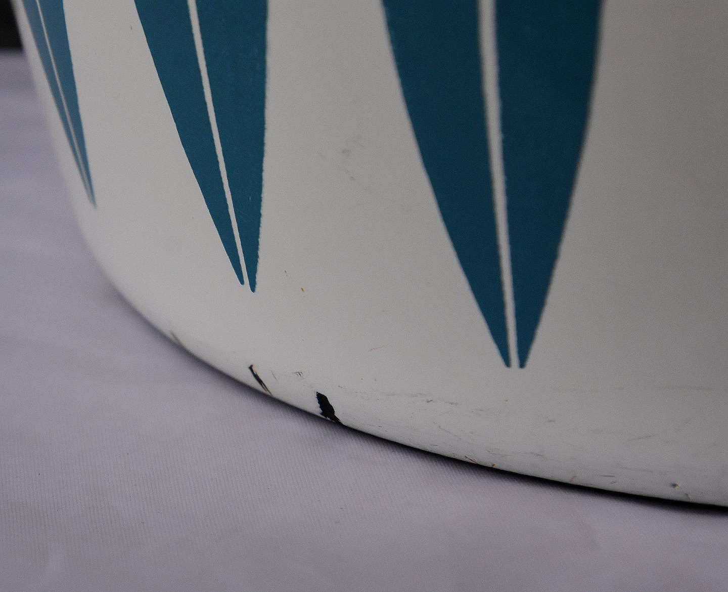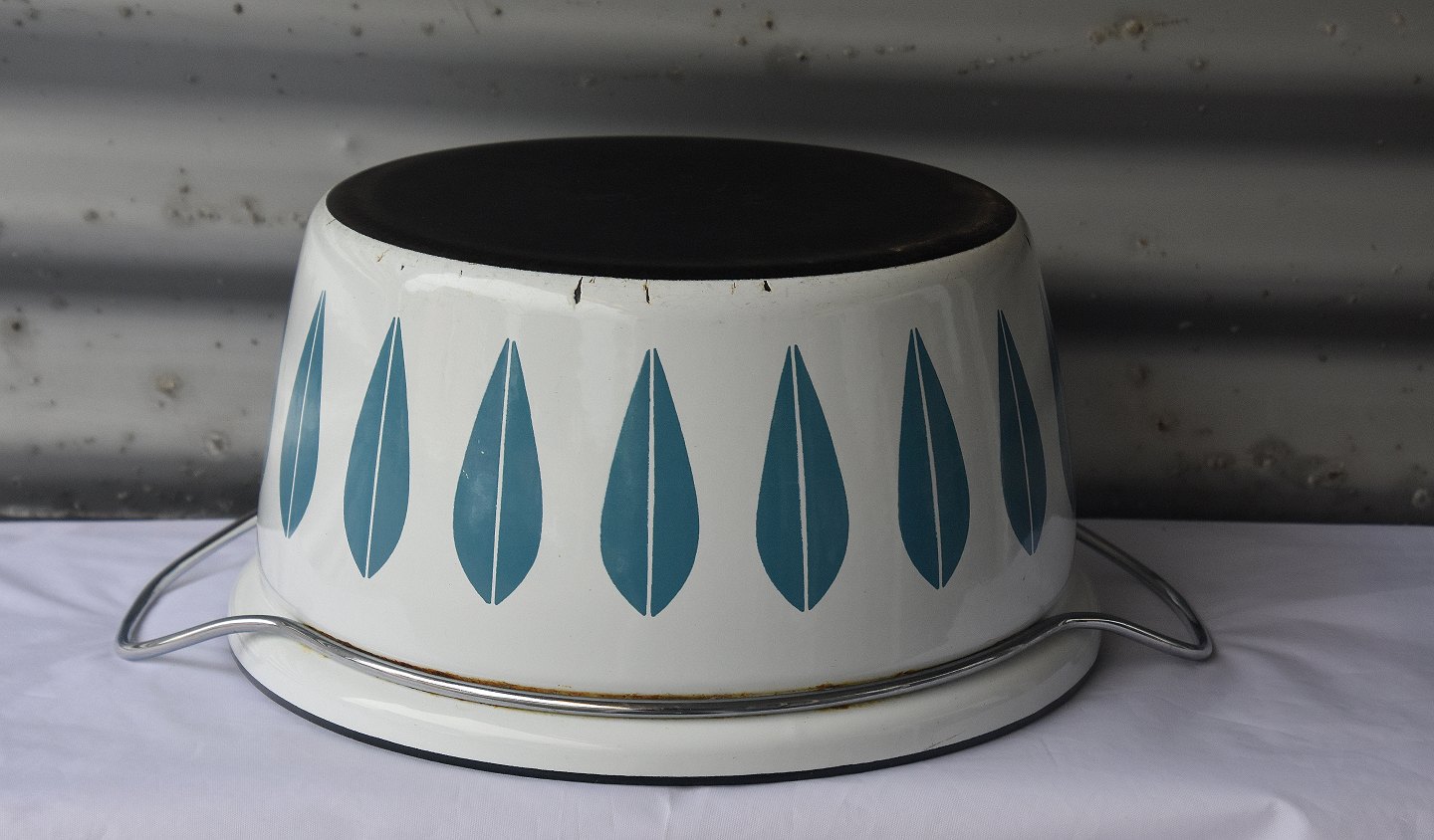 Lotusgryde, hvid med blå blade og blåt låg. Gryden er emaljeret
