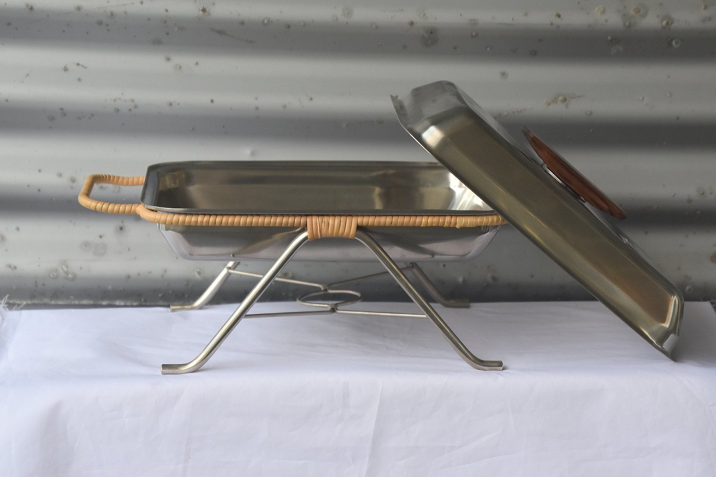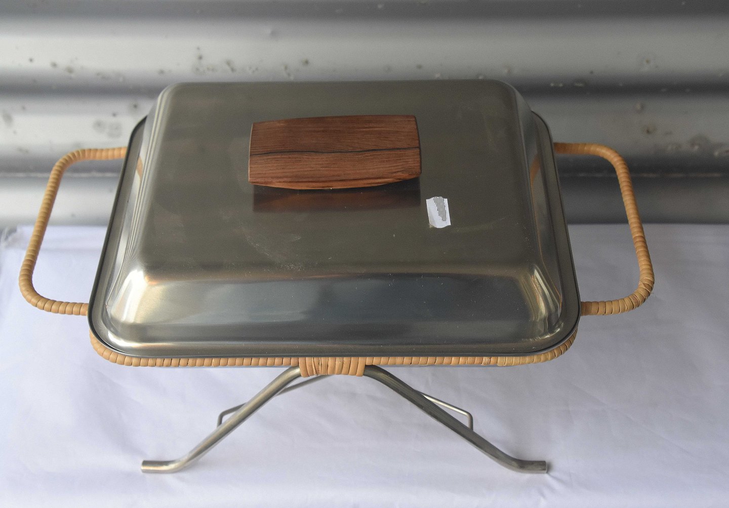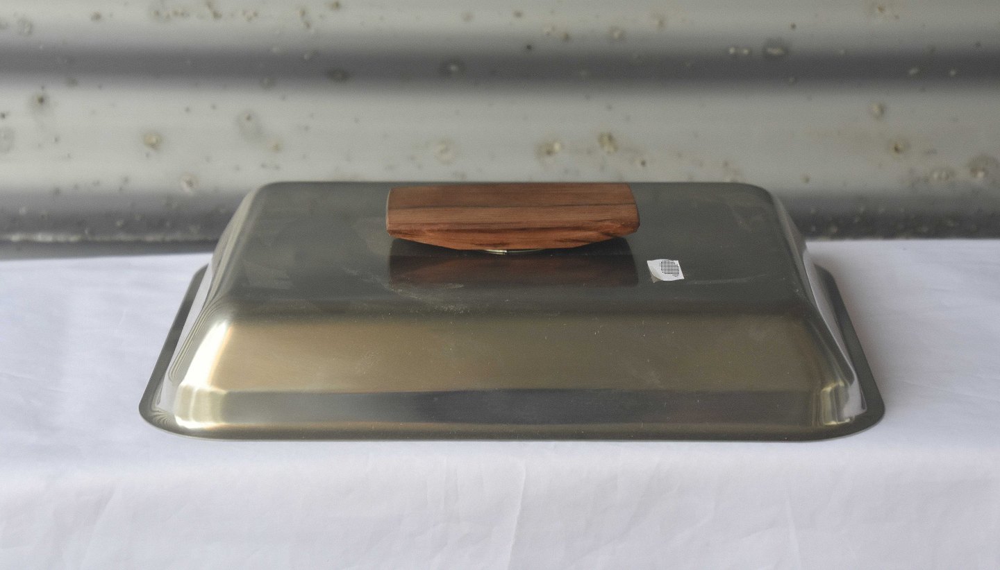 Lågfad i rustfrit stål med greb i teaktræ, med tilhørende holder omsnoet med bambusflet