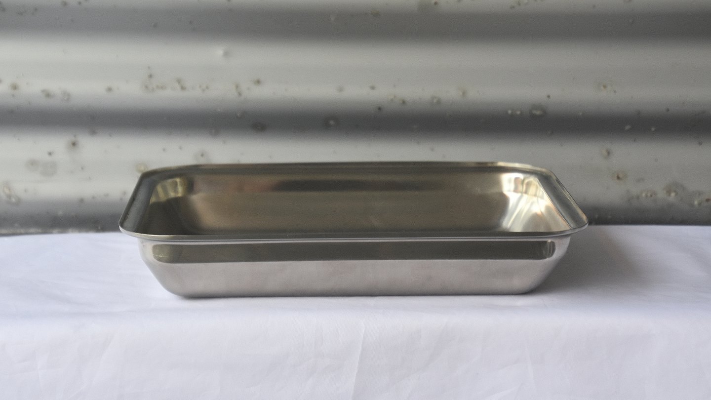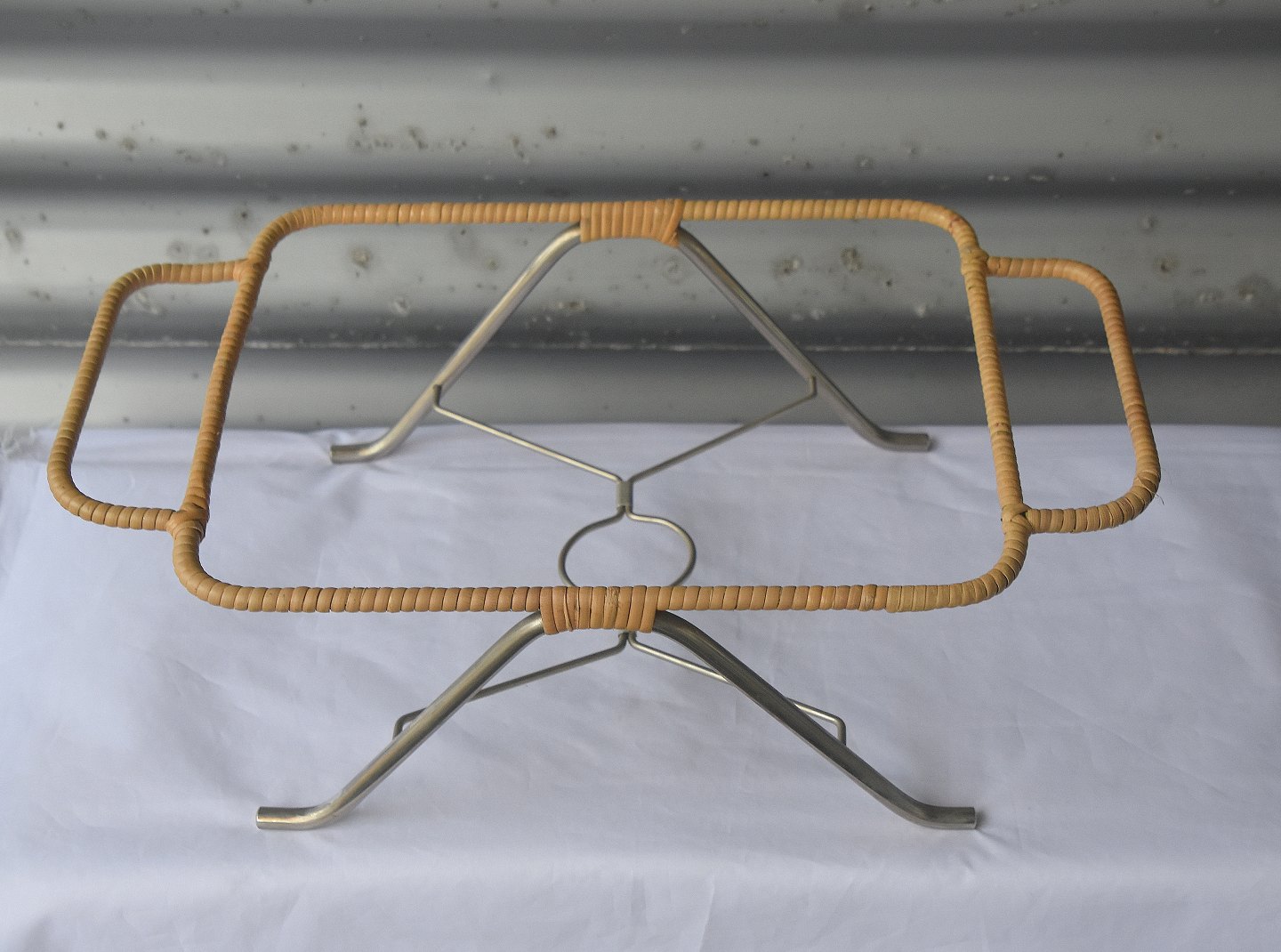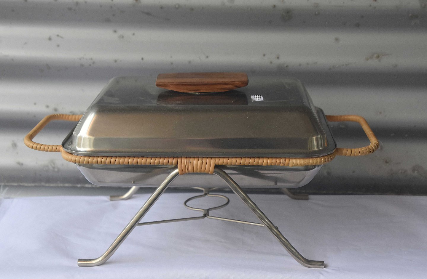 Lågfad i rustfrit stål med greb i teaktræ, med tilhørende holder omsnoet med bambusflet