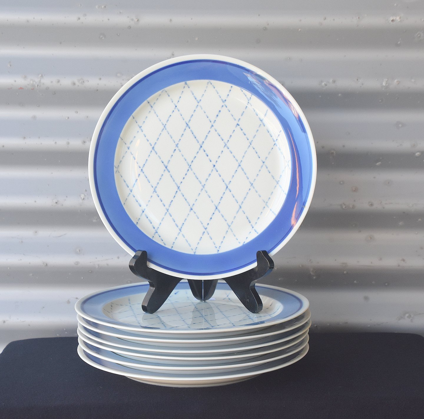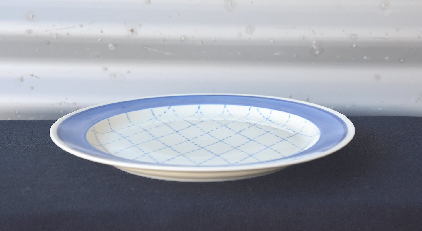 Prik: hvidt porcelæn med punkterede linier og et bredt blåt bånd