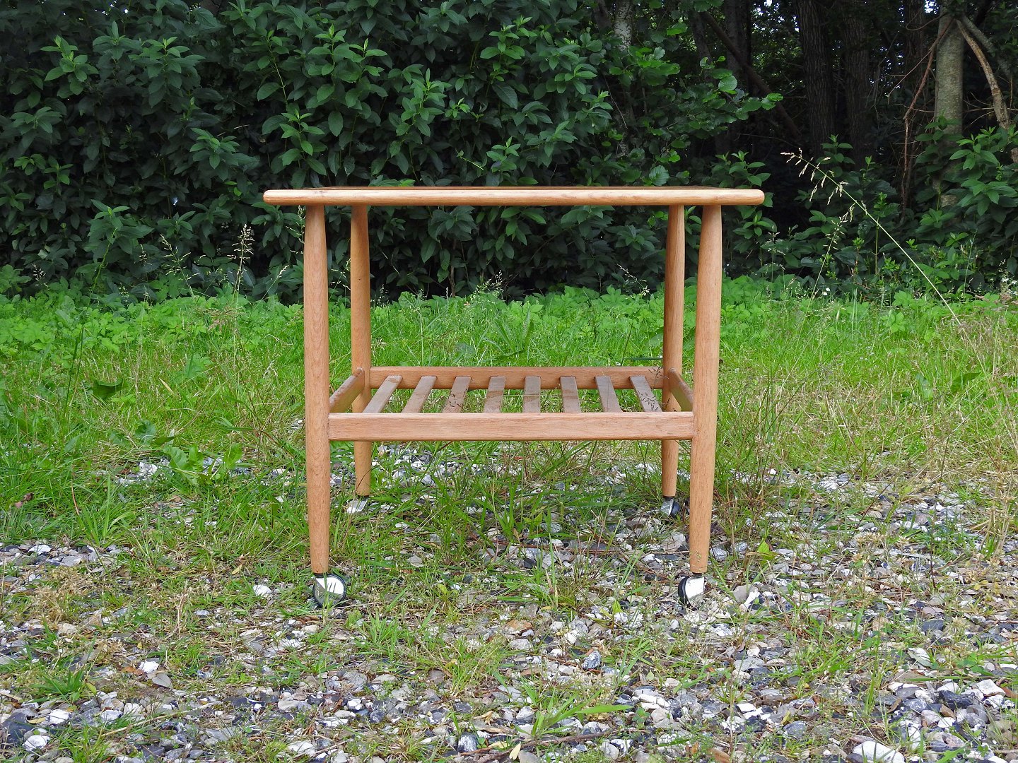 Rullebord i lakeret egetræ med tremmehylde hylde og Orbit hjul