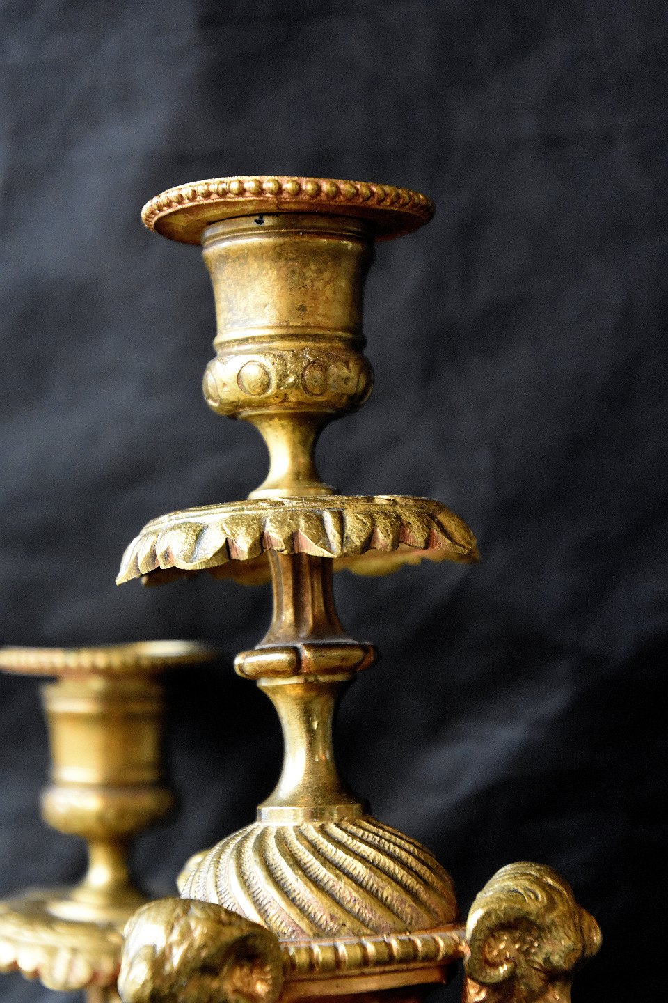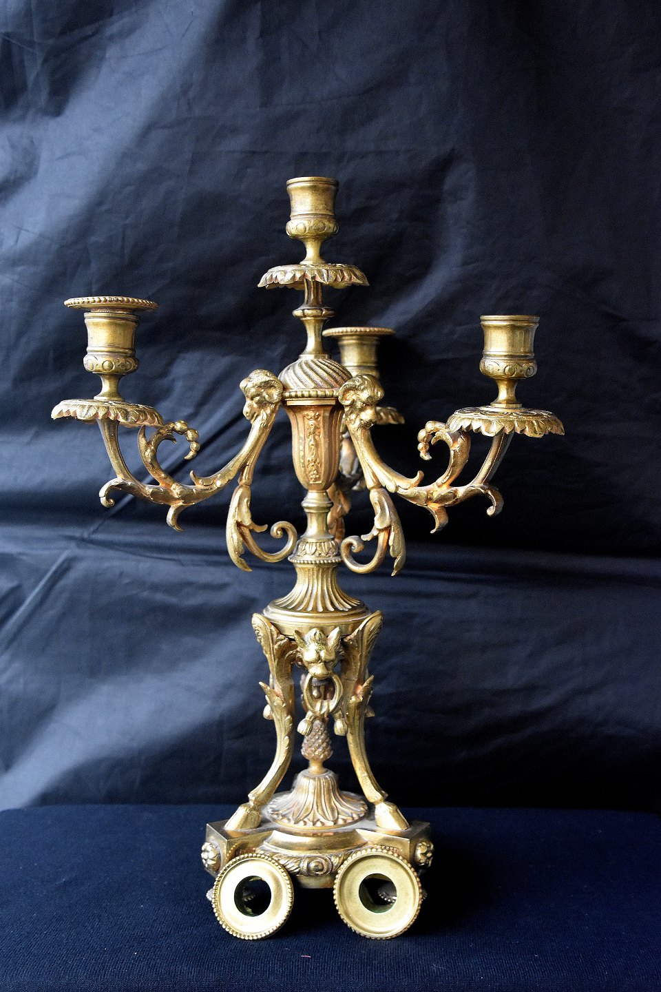 Antik, 5-armet, kandelaber, lysestage, patina, fransk