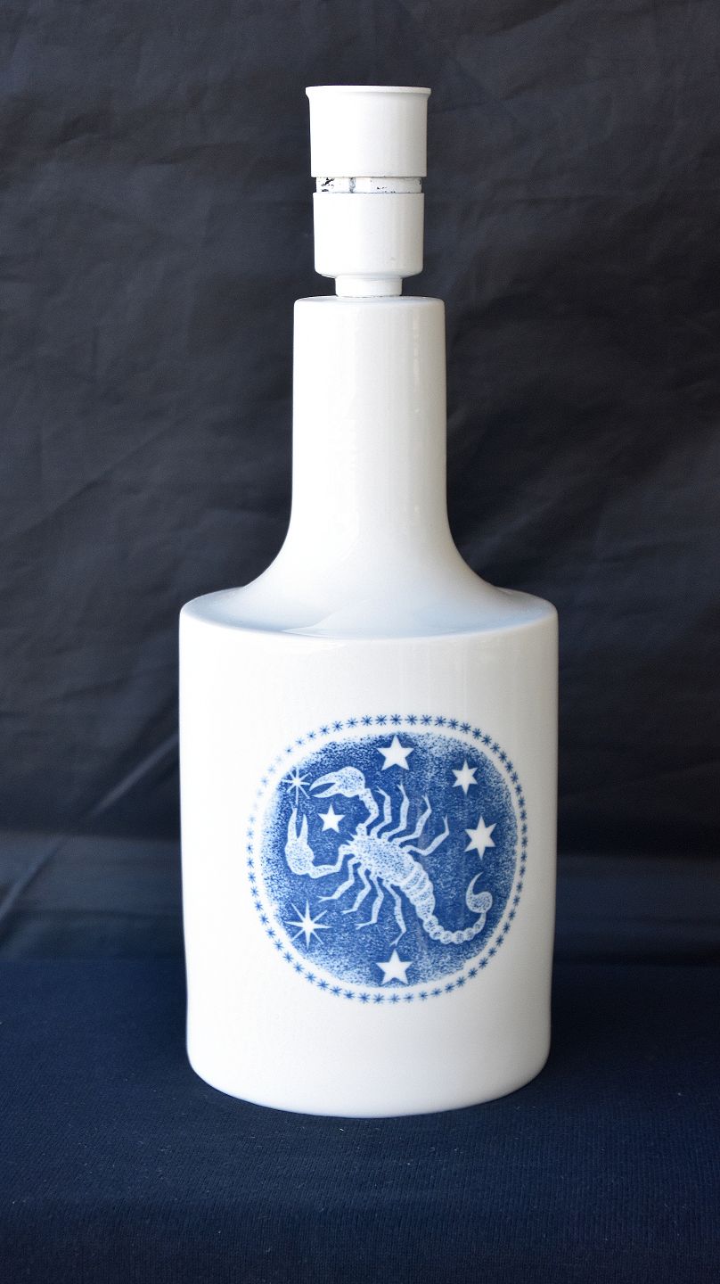 Bordlampe men motiv af "Skorpion", nr. 927238, stjernetegn. Kun udført i 1200 eksemplarer. Fremstillet ved Royal Copenhagen For Fog & Mørup