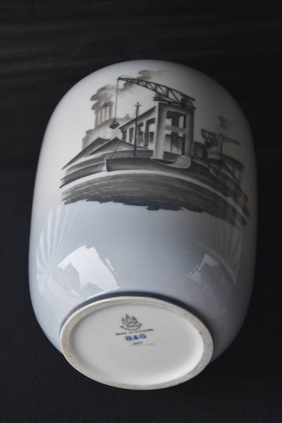 Bing & Grøndahl, vase Made in Denmark, 1. sortering. Dekorationen på vasen er et stiliseret værftsbillede