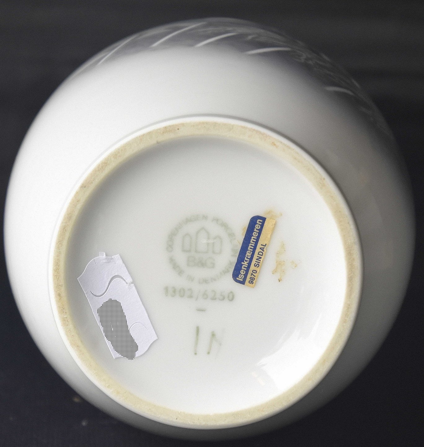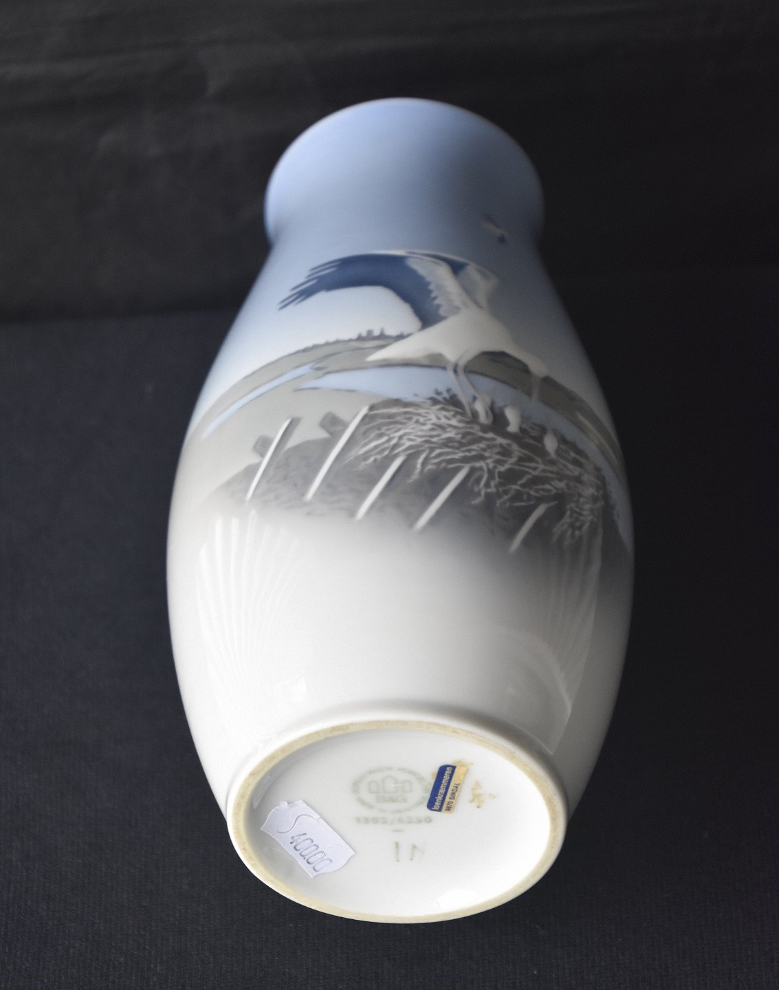 Bing & Grøndahl, vase 1302-6250, 1. sortering. Dekoration på vasen er en storkerede på husets tag og storken der fodre sine unger