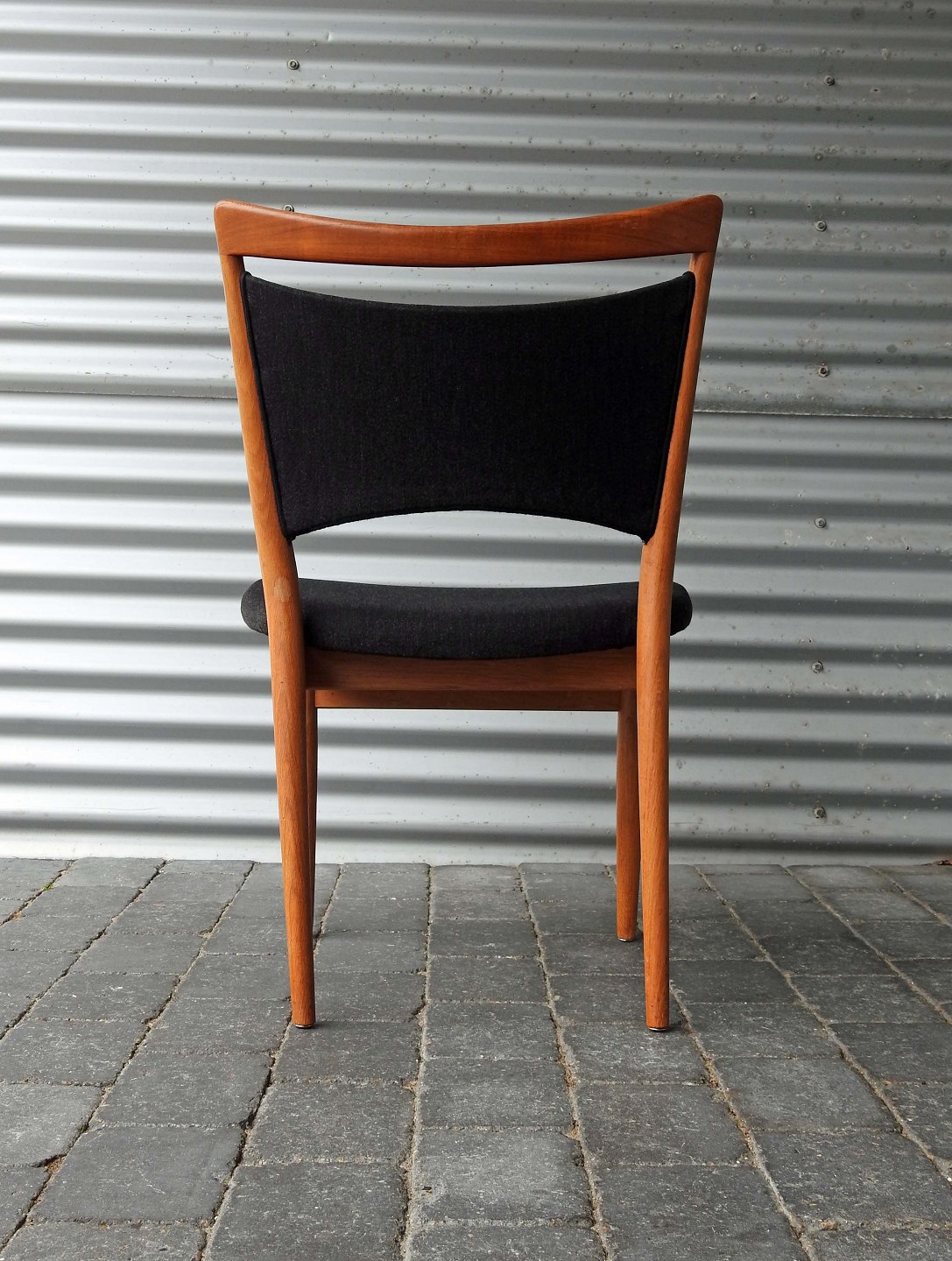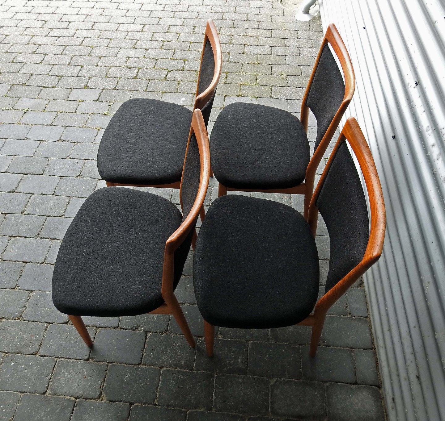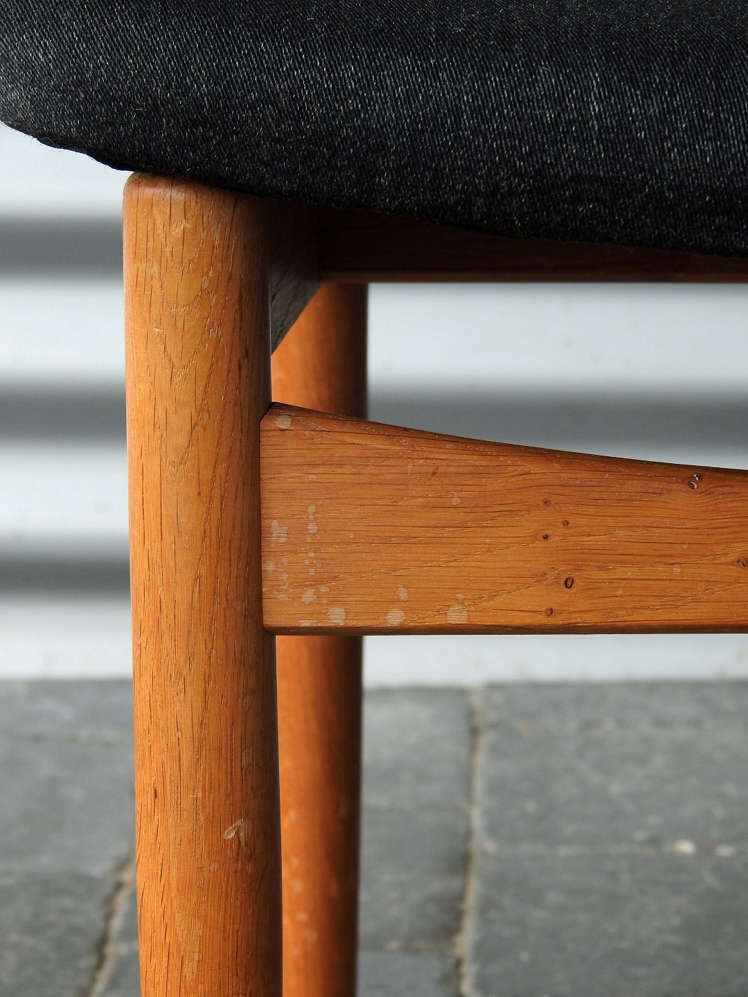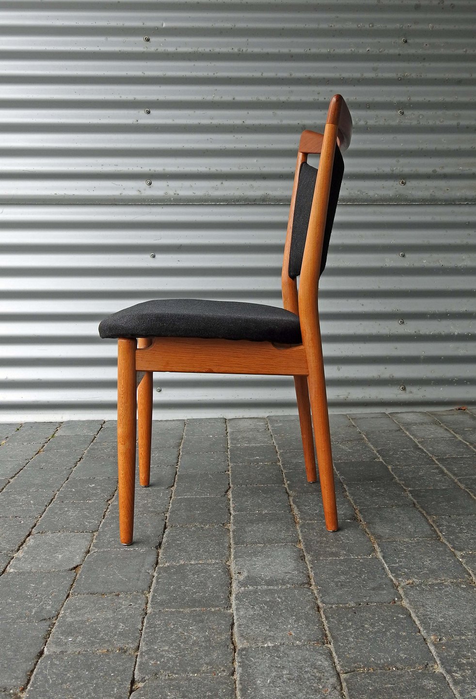 Et sæt med fire stole i eg med sæde betrukket med sort uldstof