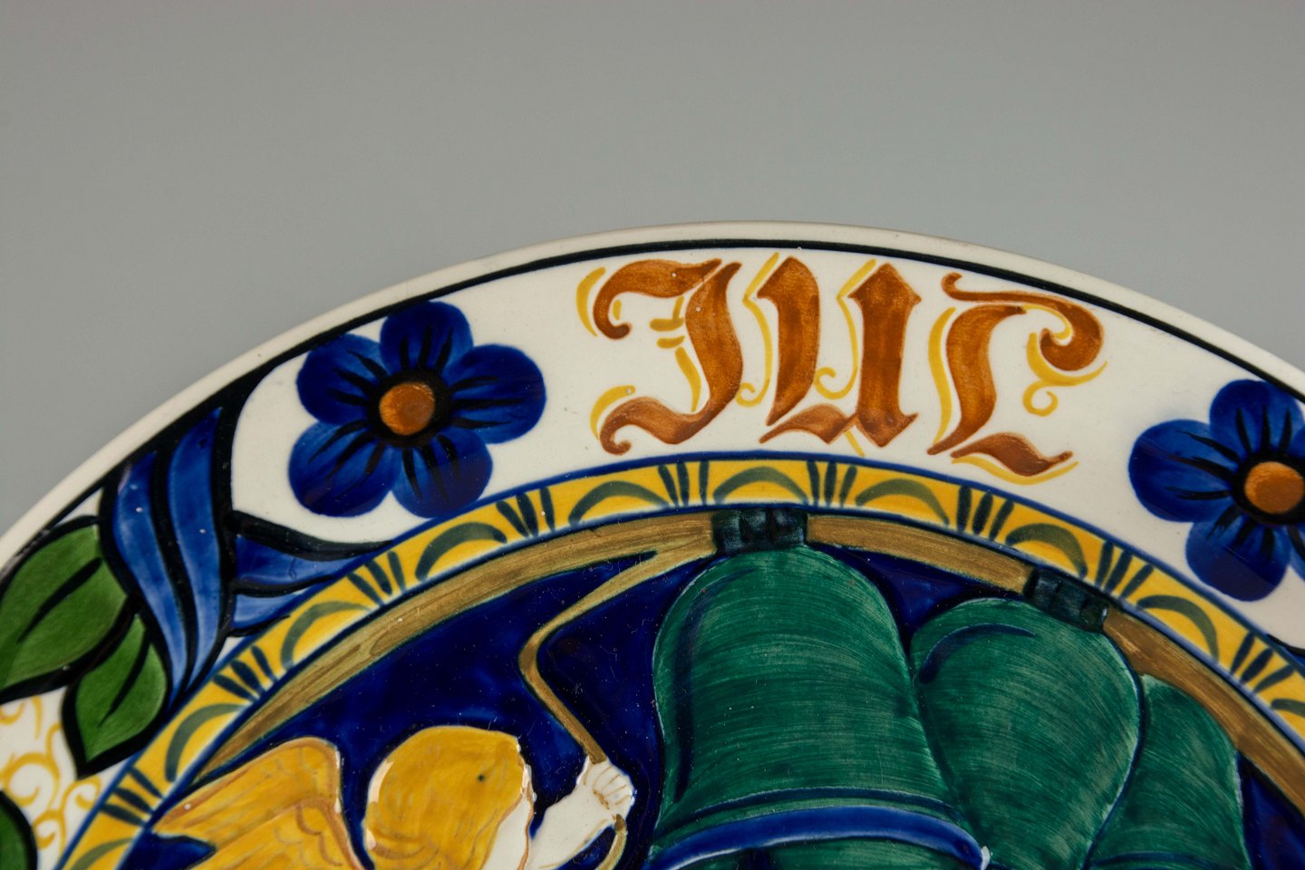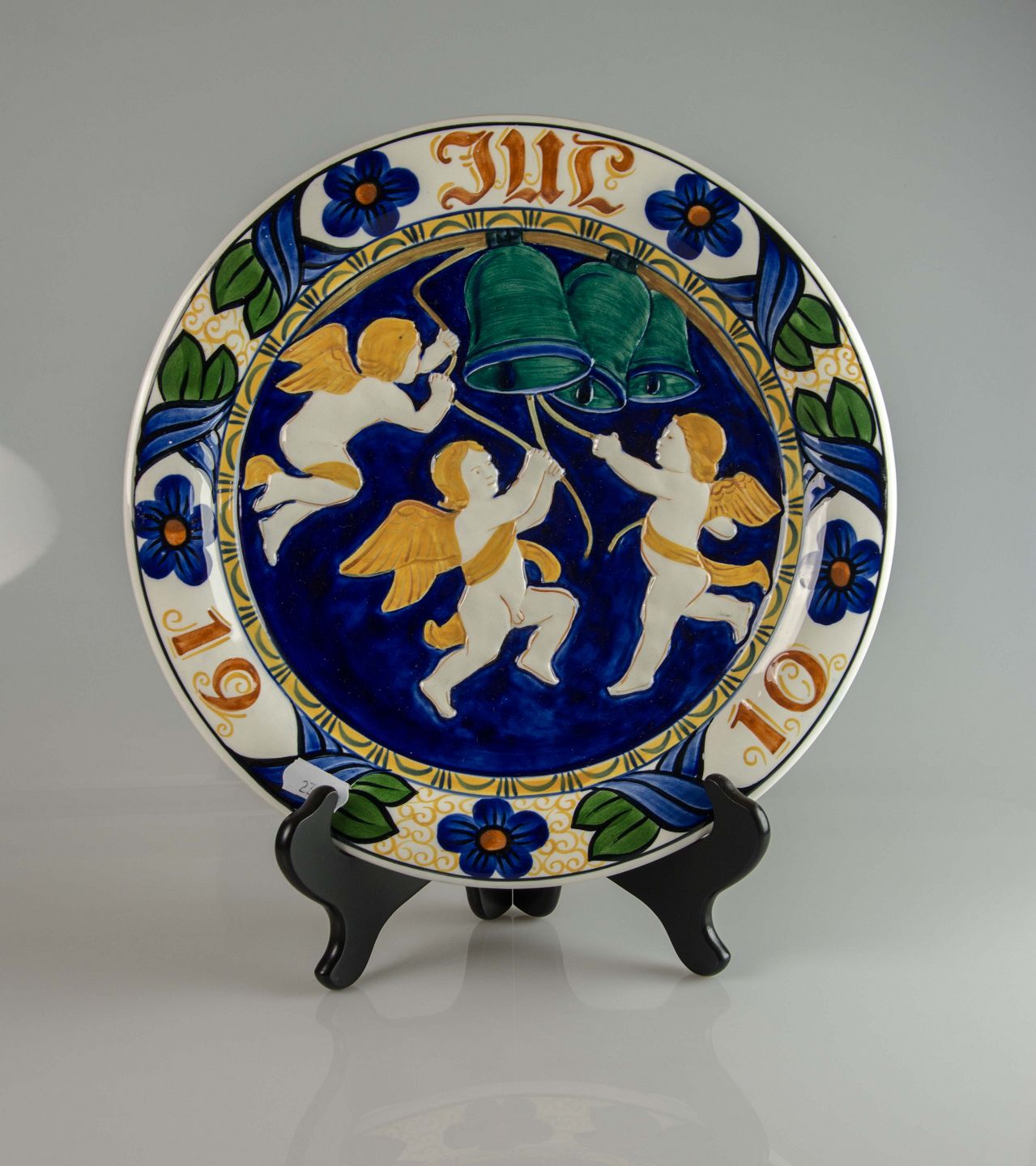 Stor julerelief år 1910 i fajance med motiv af flyvende engle og klokker nr. 765/650